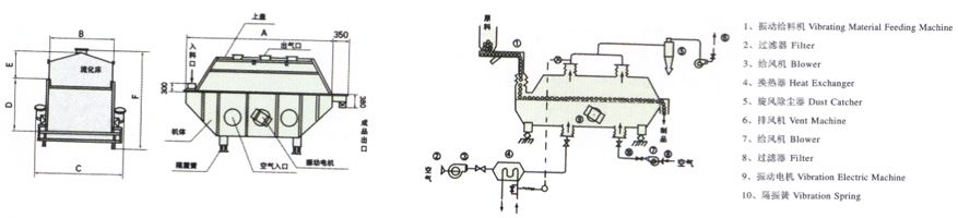 物料自进料口进入机内,在振动力作用下,物料沿水平方向抛掷向前连续运动,热风向上穿过流化床同湿物料换热后,湿空气经旋风分离器除尘后帽排风口排出,干燥物料由排料口排出。