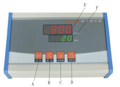 3.定时功能:打开开关,time窗口显示上次操作设定的定时时间。按下SET设定键, r/min窗口的数字闪烁,再按下SET设定键,r/min窗口设定状态退出,time窗口的数字闪烁,time窗口的数字可通过“<”“∨”“∧”按键调整。再按下SET键,可退出time窗口定时时间设定状态,time窗口时间设定完成。设定出所需的定时时间如:5分钟, time窗口的数字随搅拌时间增长而依次递减,5、4、3、2、1直至显示End,搅拌停止,此时 r/min窗口显示“0”。 timing窗口单位为分钟,可定时范围为1-999,time窗口数字设定为“0”,为不定时状态。