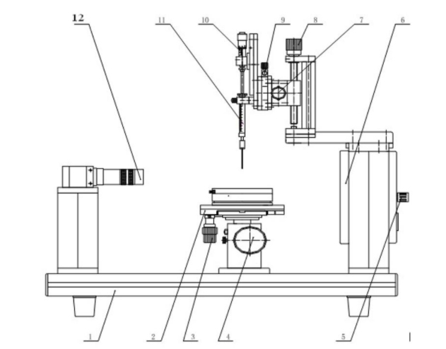 1.机架2.置物工作台3.置物台前后移动旋钮4.置物台上下移动旋钮5.背光屏亮度.调节旋钮6. 背光屏7. 进样架左右调节8. 进样架上下调节9. 进样架角度微调10.进样液注入旋钮11. 进样针简12. 工业照相机