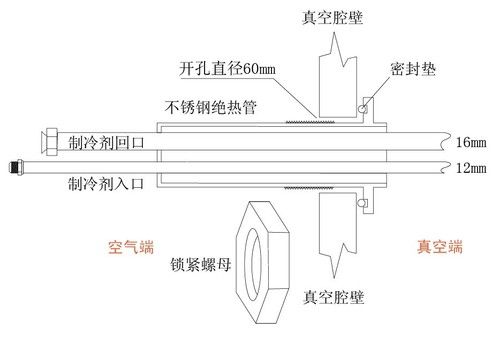 冷凝盘管从真空腔内穿过腔壁时,由于管道温度与腔壁温差较大,如果直接焊接,冷量将会有较大损失,腔壁结霜严重,这就需要一个长约20厘米的薄壁不锈钢管做成的绝热装置来解决,它可以做成活口(见上图),也可以不用密封垫,直接焊接到真空腔壁。