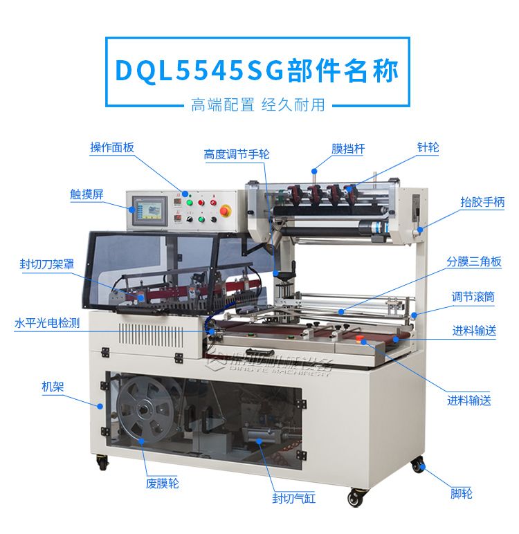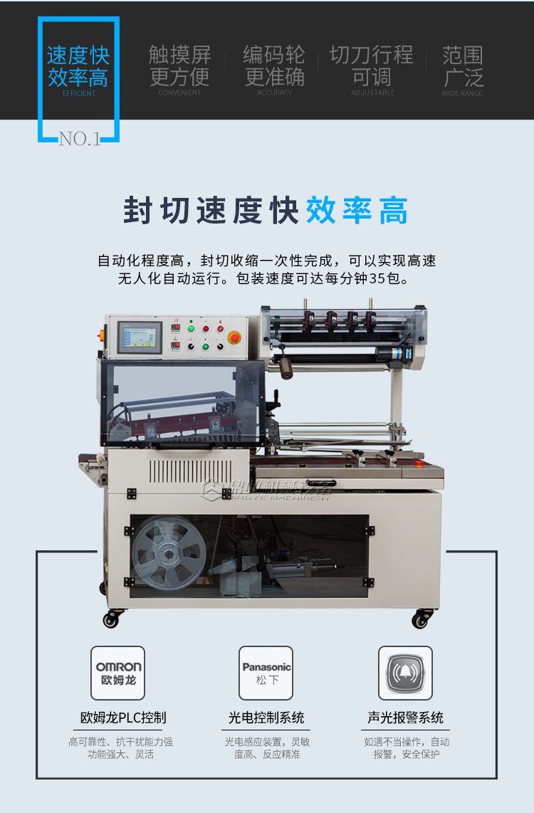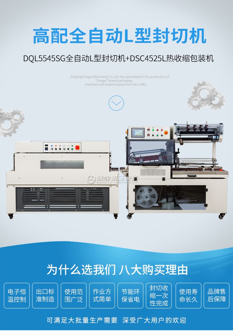 DQL5545SG封切机+DSC4525L收缩机是我公司自主研制的全自动边封机,用于大批量包装的流水作业,全自动进料、输送、入袋、封口一次性完成,工作效率高,克服了同类产品中的某些不足或功能欠缺,大胆采用全新的结构方式,突出了人性化设计。因此,操作起来更加得心应手。该机广泛应用于食品、文具、饮料、印刷、药品、地板、五金等行业的收缩包装。因其包装速度快,可满足大批量生产需求,而且包装成本低廉,故深受广大用户的欢迎。