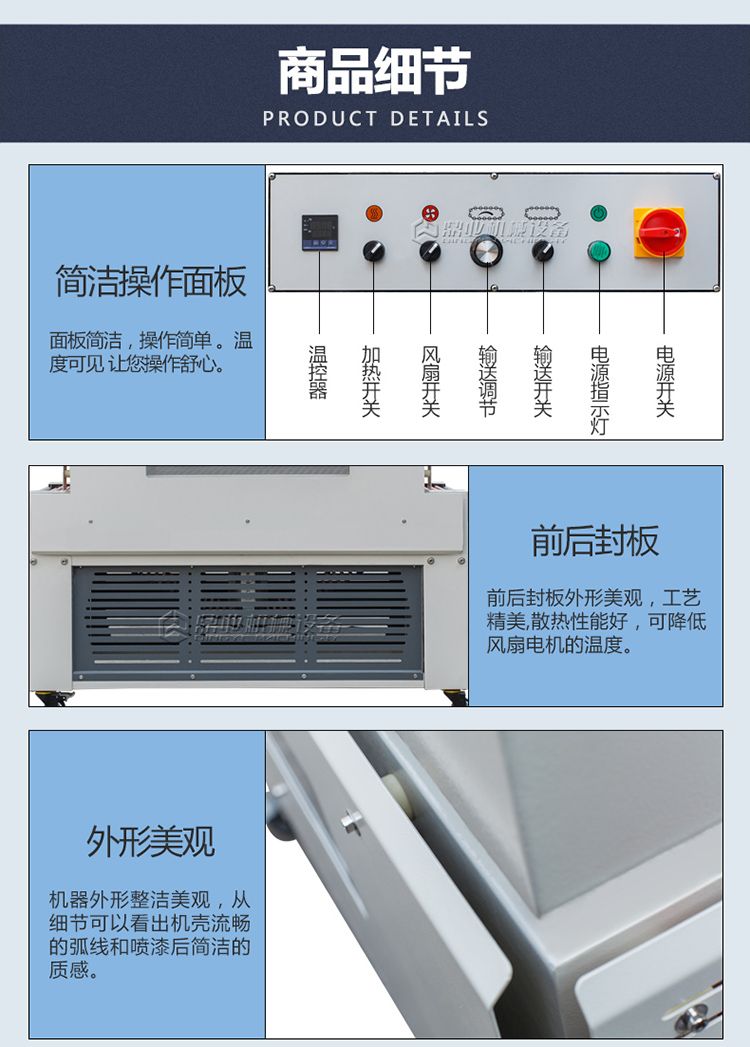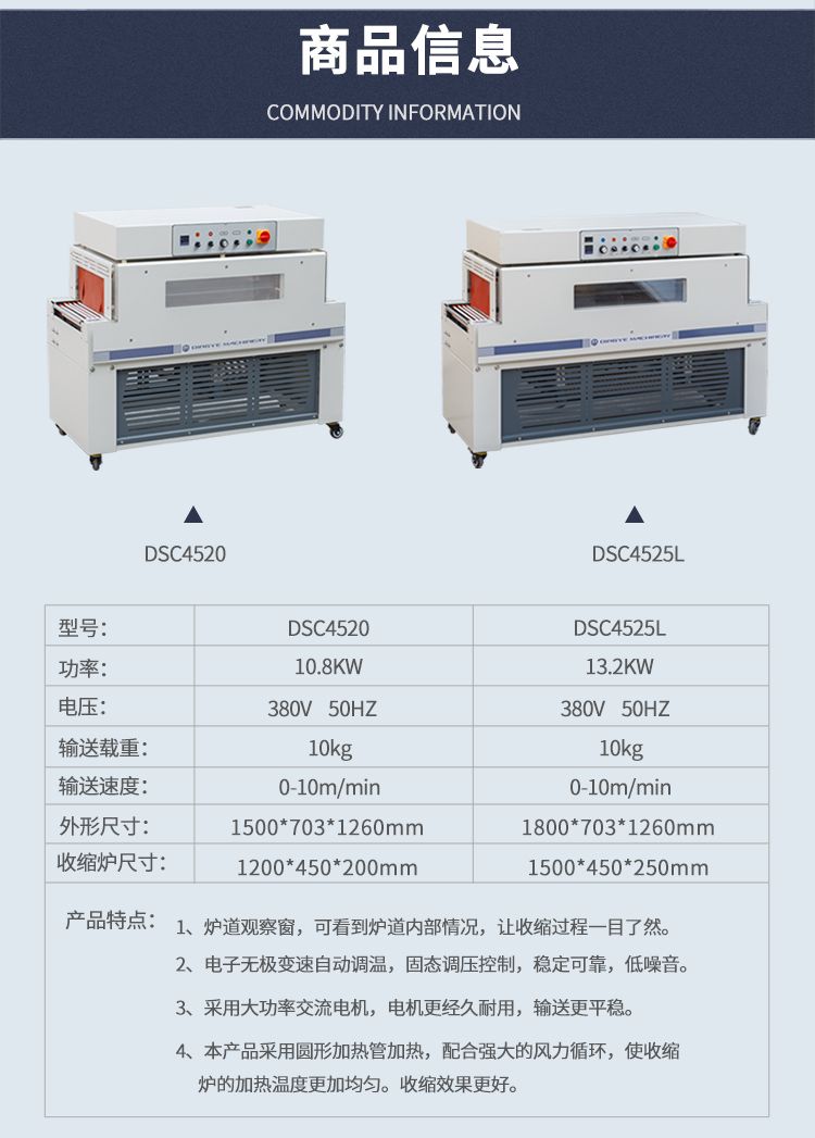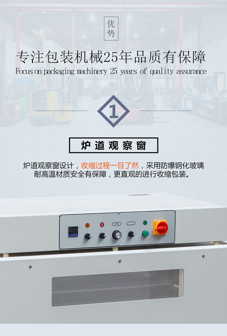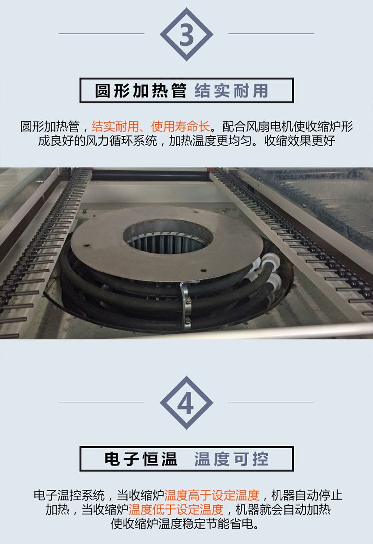 热缩包装设备采用收缩膜包裹在产品或包装件外边,经过加热使收缩薄膜裹紧产品或包装件,充分显示物品外观、提高产品的展销性、增加美观及价值感;同时包装后的物品能密封、防潮、防污染,并保护商品免受来自外部的冲击,具有一定的缓冲性;尤其是当包装易碎品时,能防止器皿碎时飞散;此外可减低产品背拆、背窃的可能性;适用于多件物品紧包装和托盘包装。热缩包装设备被广泛应用于玻璃瓶、发泡胶、纸盒、玩具、电子、电器、文具、图书、唱片、五金工具、日用品、药品、化妆品、饮料、水果、纪念标签等物品包装。