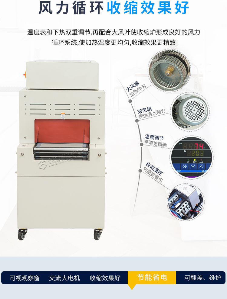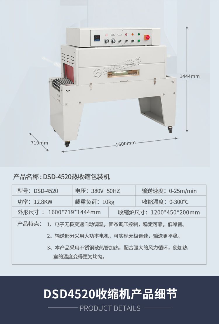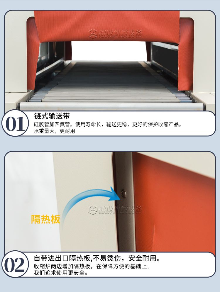 热缩包装设备采用收缩膜包裹在产品或包装件外边,经过加热使收缩薄膜裹紧产品或包装件,充分显示物品外观、提高产品的展销性、增加美观及价值感;同时包装后的物品能密封、防潮、防污染,并保护商品免受来自外部的冲击,具有一定的缓冲性;尤其是当包装易碎品时,能防止器皿碎时飞散。