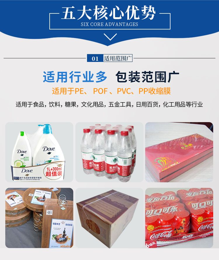 热收缩包装是目前市场上较为先进的包装方法之一,它是采用收缩薄膜包裹在产品或包装件外面,经过加热,使收缩薄膜收缩裹紧产品或包装件,充分显示才、物品的外观,提高产品的展销性,增加美观及价值感。同时,包装后的物品能密封、防潮、防污染,并保护商品免受来自外部的冲击,具有一定的缓冲性,尤其是当包装易碎品时,能防止器械破碎时飞散。此外,可降低产品被拆、被窃的可能性。适用于食品、饮料、糖果、文华用品、五金工具、日用百货、化工用品等行业。