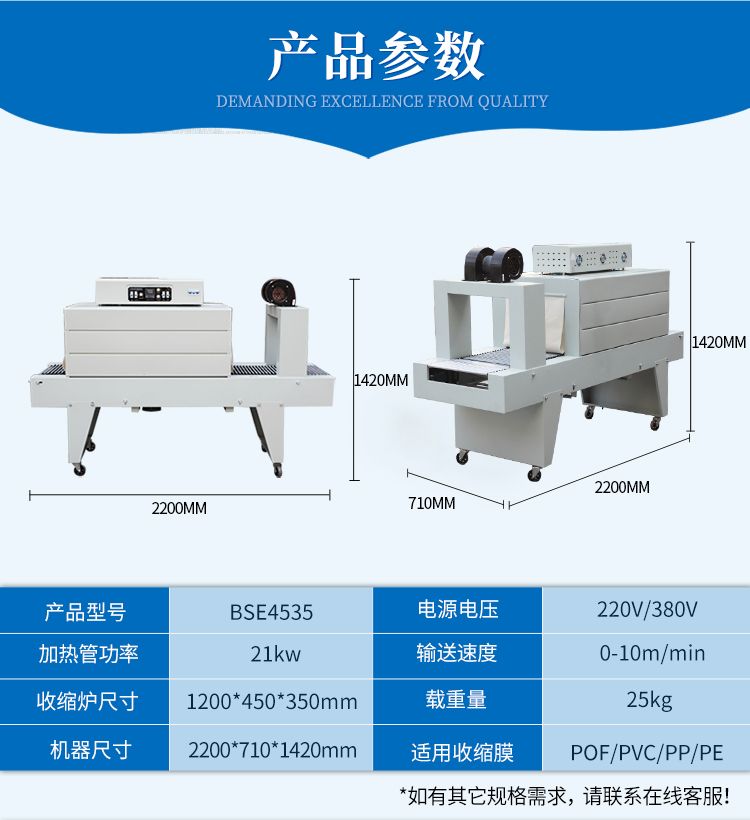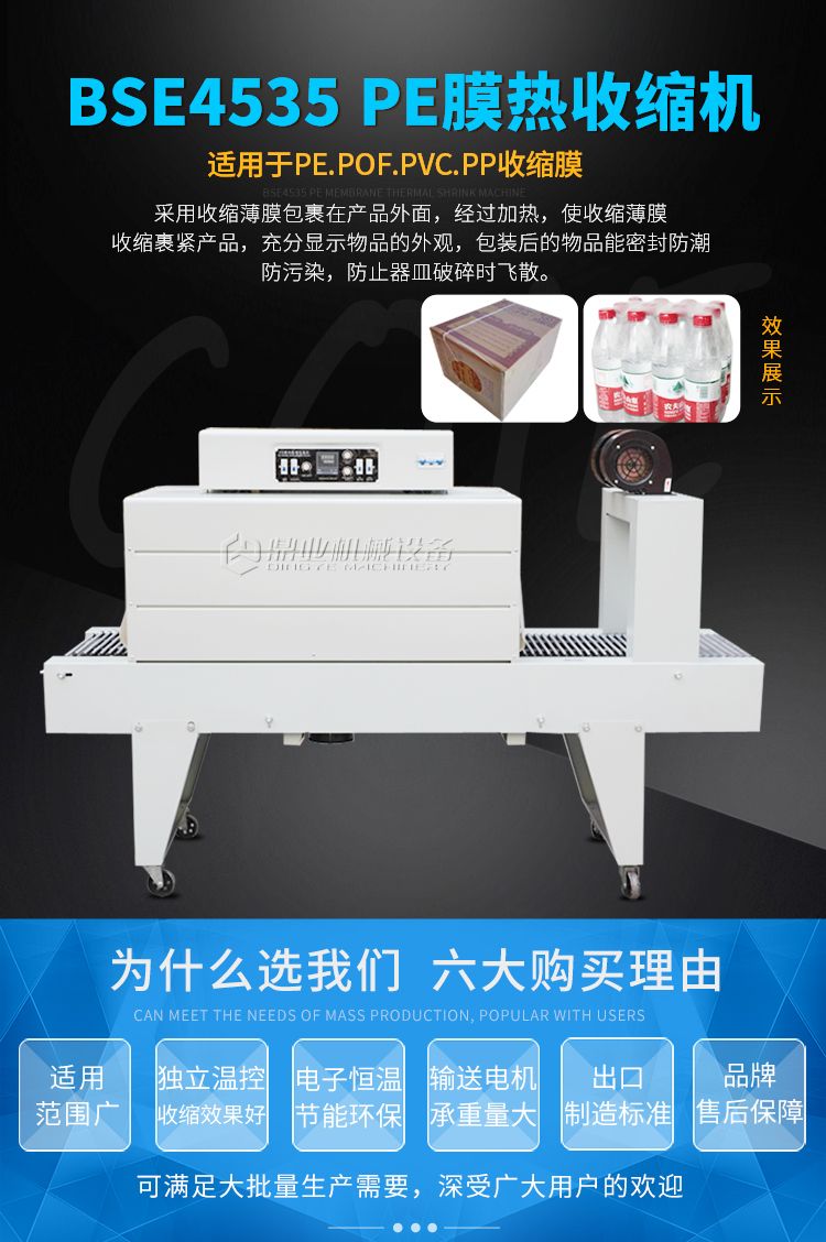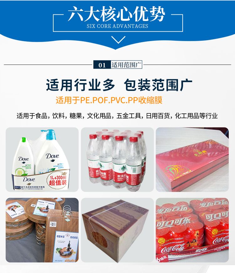 热收缩包装是目前市场上较为先进的包装方法之一,它是采用收缩薄膜包裹在产品或包装件外面,经过加热,使收缩薄膜收缩裹紧产品或包装件,充分显示才、物品的外观,提高产品的展销性,增加美观及价值感。同时,包装后的物品能密封、防潮、防污染,并保护商品免受来自外部的冲击,具有一定的缓冲性,尤其是当包装易碎品时,能防止器械破碎时飞散。此外,可降低产品被拆、被窃的可能性。适用于食品、饮料、糖果、文华用品、五金工具、日用百货、化工用品等行业。