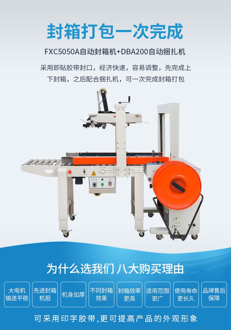 打包封箱一体机是以BOPP胶纸为封箱材料,可同时对纸箱进行上下“一”字型封箱,两侧马达驱动皮带自动校正、输送纸箱,封箱时快速平稳,适用于较重较宽纸箱。两侧辅助轮协助机器封箱时中缝集中不开裂。台面高度、纸箱宽度高度可自主调节,简单实用。造型典雅大方,配备刀片防护装置,避免操作时意外刺伤。机件稳固耐用,使用寿命长。机身自带四个高强度刹车轮,换位工作非常方便。