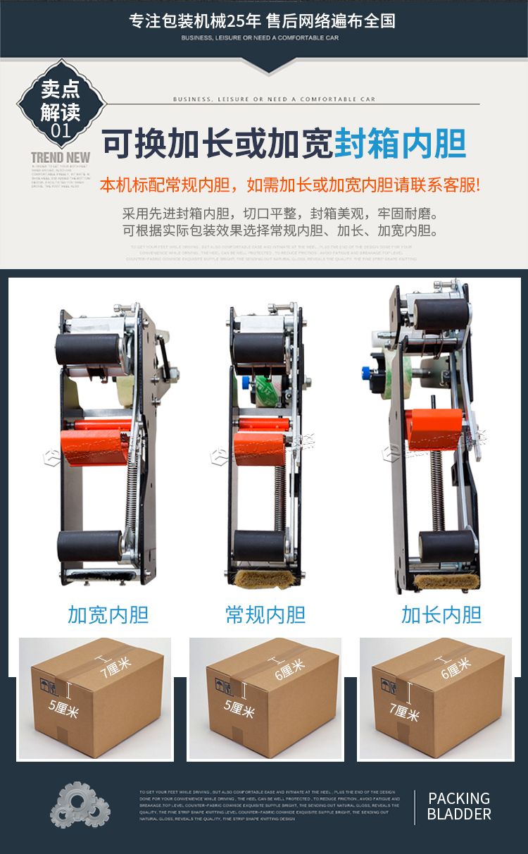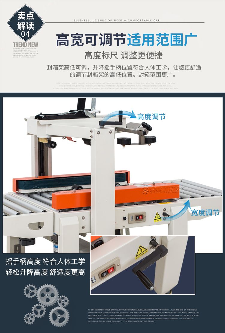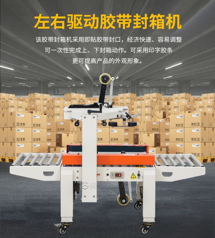 左右驱动封箱机是以BOPP胶纸为封箱材料,可同时对纸箱进行上下“一”字型封箱,两侧马达驱动皮带自动校正、输送纸箱,封箱时快速平稳,适用于较重较宽纸箱。两侧辅助轮协助机器封箱时中缝集中不开裂。台面高度、纸箱宽度高度可自主调节,简单实用。造型典雅大方,配备刀片防护装置,避免操作时意外刺伤。机件稳固耐用,使用寿命长。机身自带四个高强度刹车轮,换位工作非常方便。