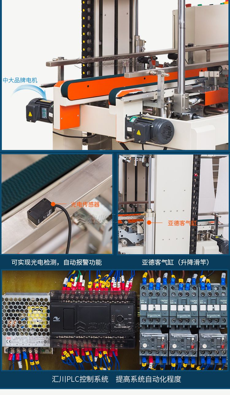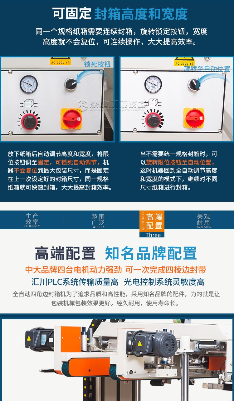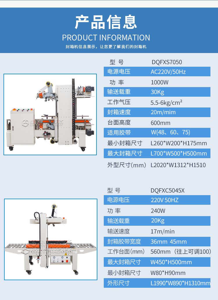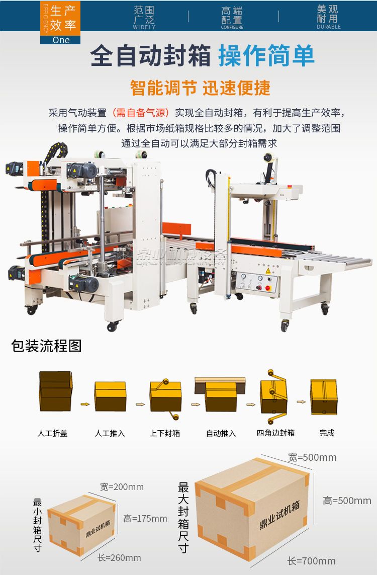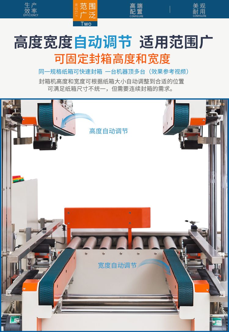 这款封箱机适合多种纸箱尺寸规格纸箱包装使用。当纸箱尺寸变化时,封箱机自动调整封箱宽度和高度。