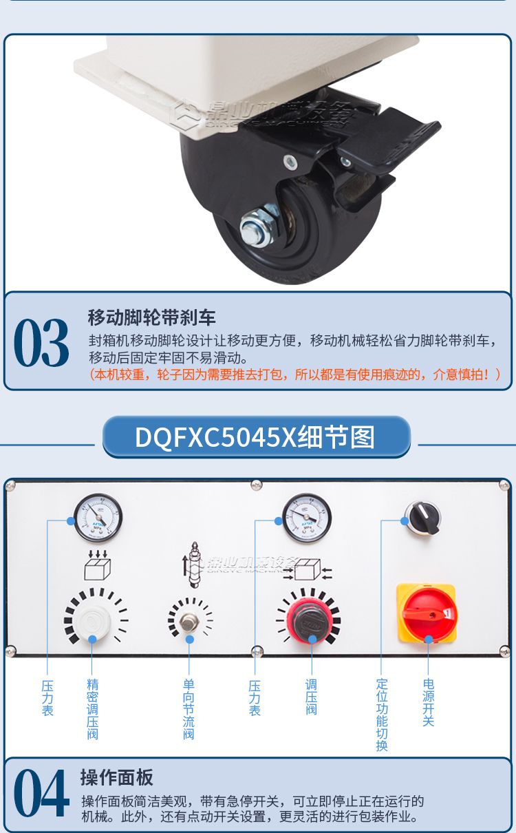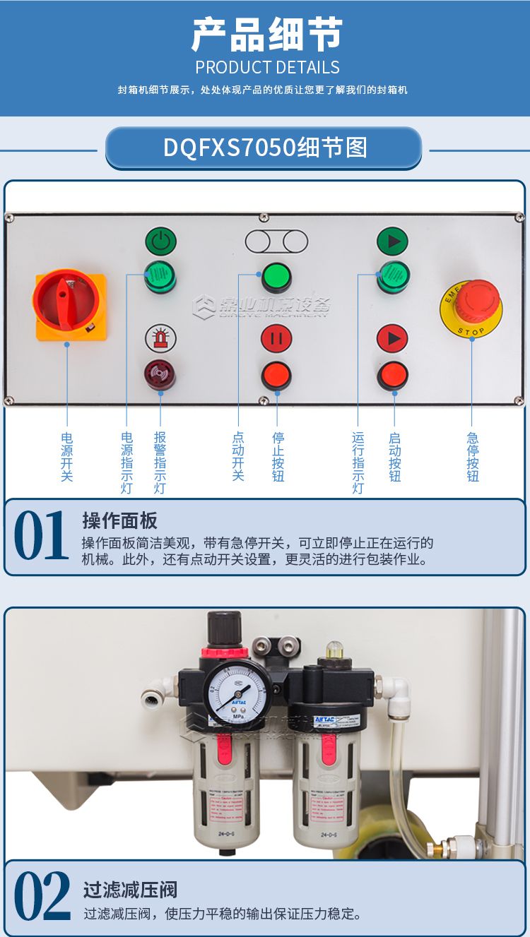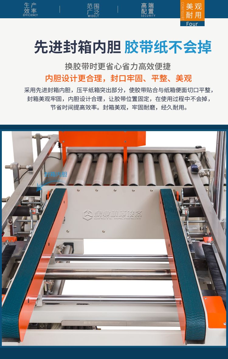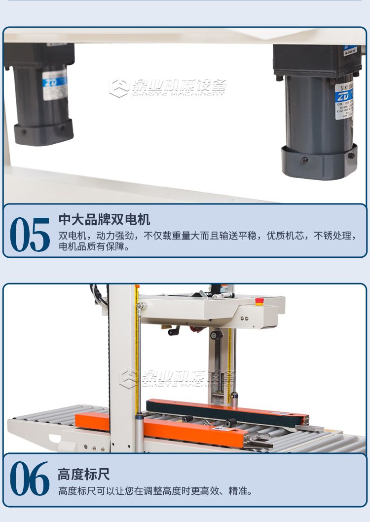这款封箱机适合多种纸箱尺寸规格纸箱包装使用。当纸箱尺寸变化时,封箱机自动调整封箱宽度和高度。