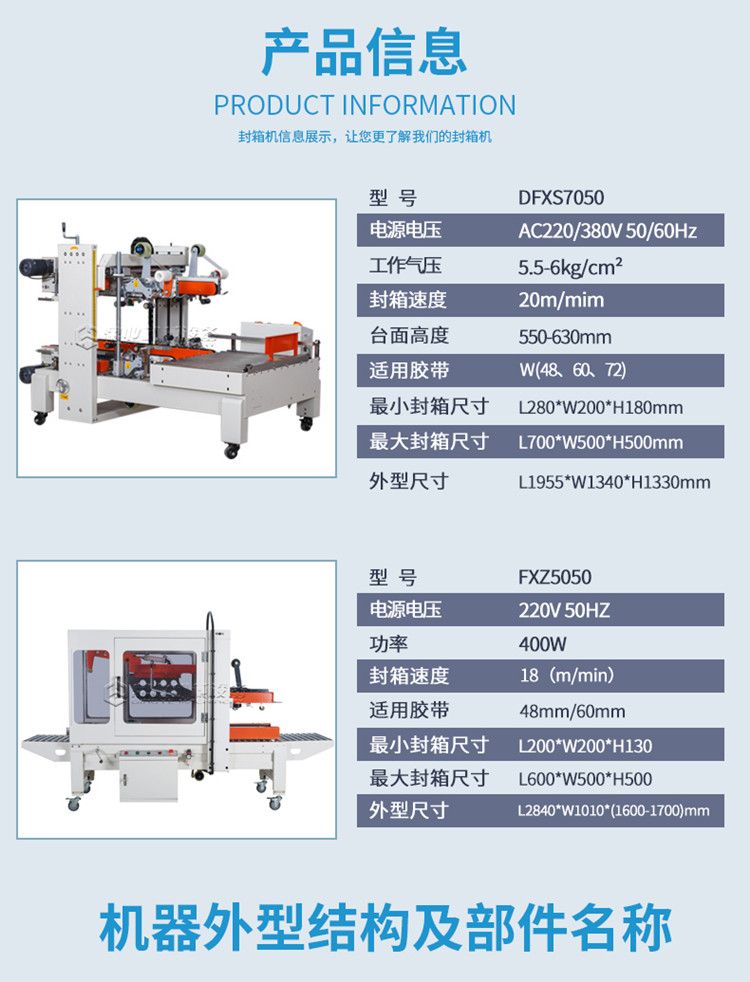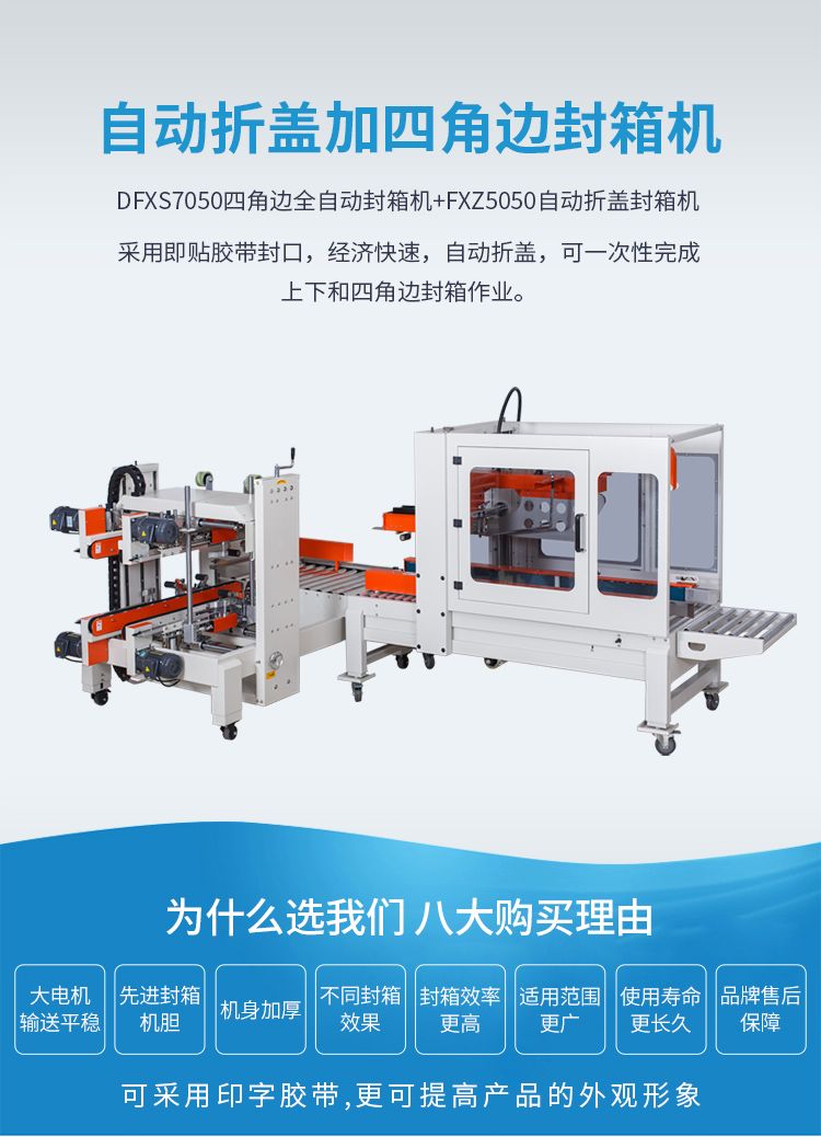 四脚边自动封箱机+折盖封箱机的诞生是根据市场纸箱规格比较多的情况,加大了调整范围通过调整升降和宽度调整手轮可以满足大部分尺寸的纸箱封箱需求。