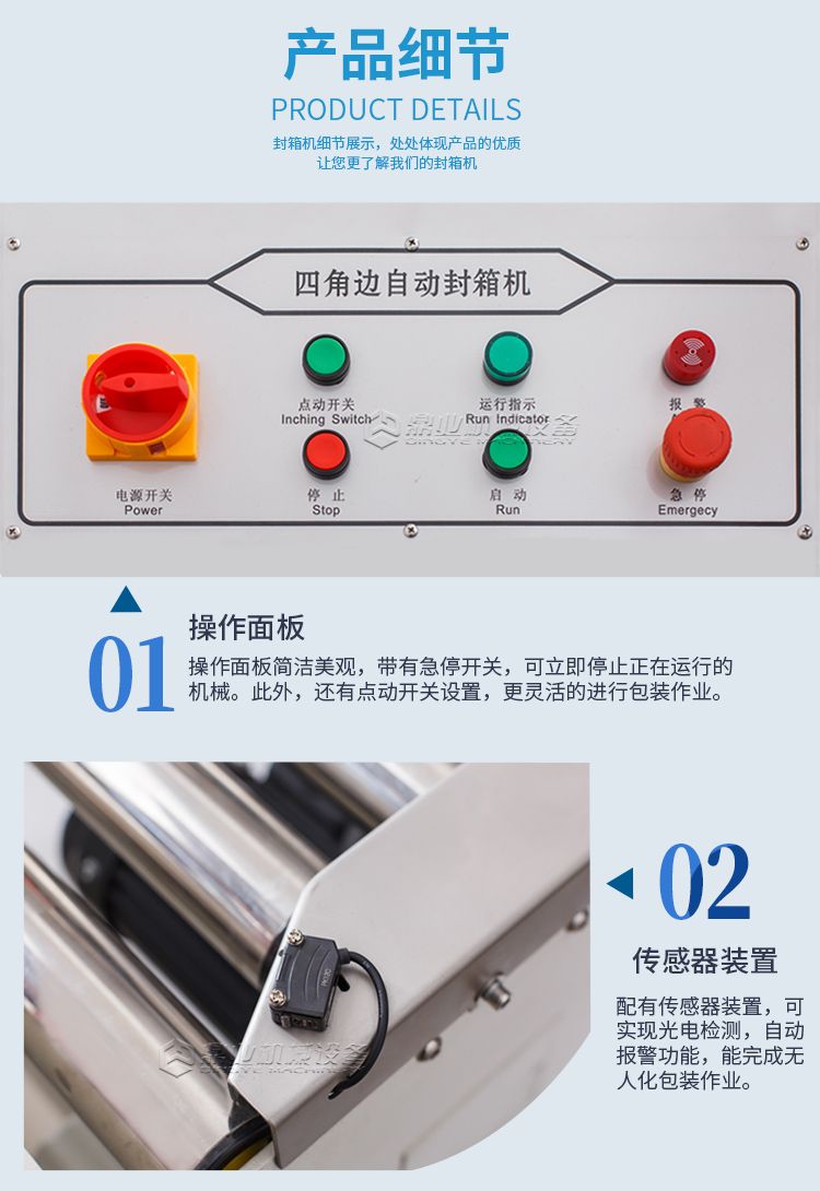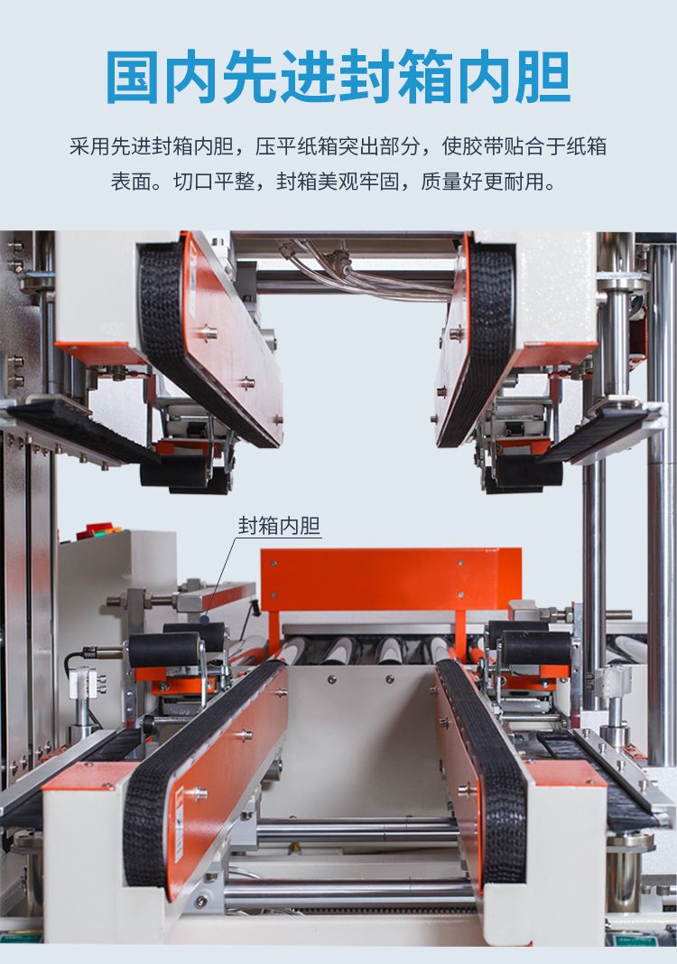 全自动四角边封箱机配置四台输送电机,搭配结实耐用的摩擦力强的输送带,不仅载重量变化大,而且输送更加平稳,完成生产作业动力十足。