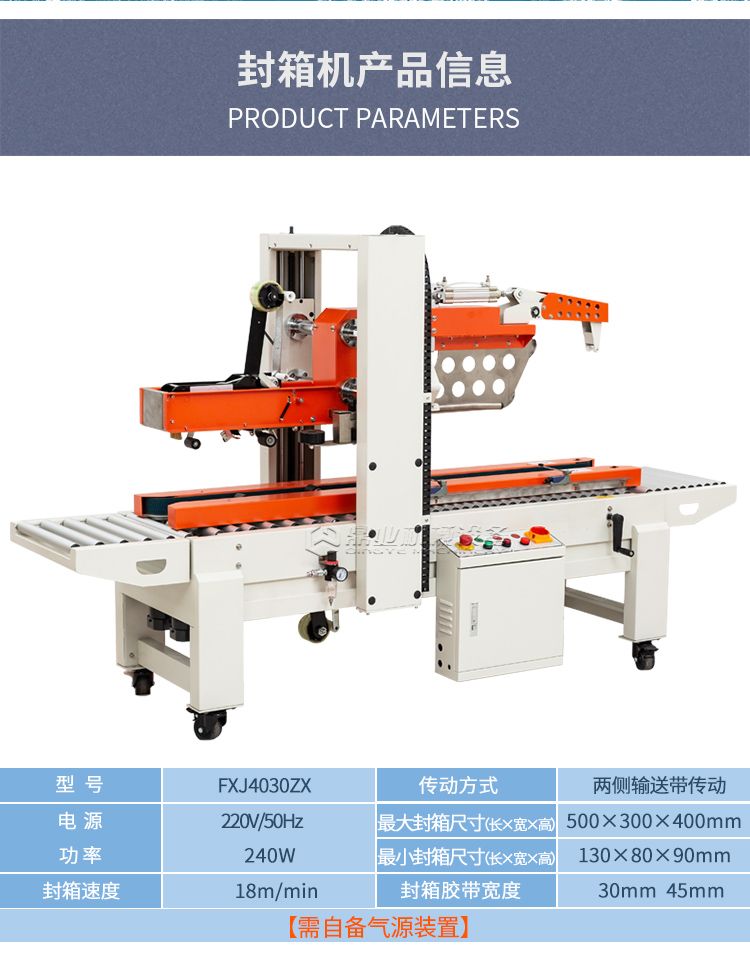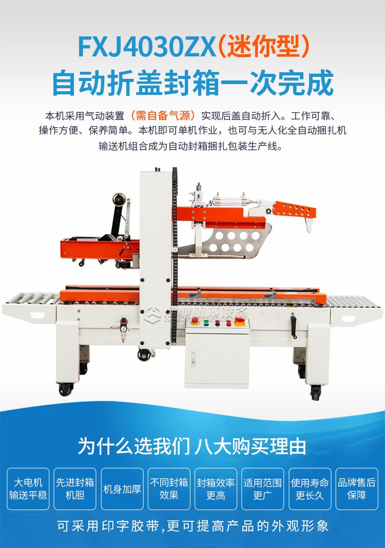 迷你型,自动折盖封箱一次完成,本机采用气动装置(需自备气源)实现后盖自动折入。工作可靠、操作方便、保养简单。本机即可单位作业,也可与无人化全自动捆扎机输送机组合成为自动封箱捆扎包装生产线。