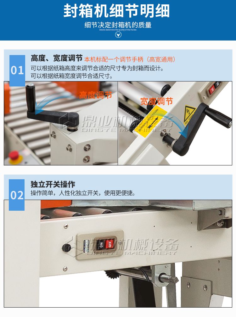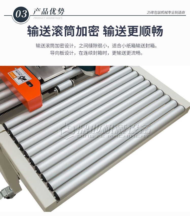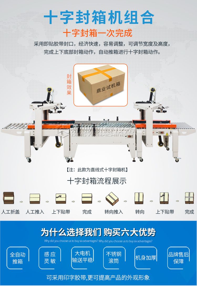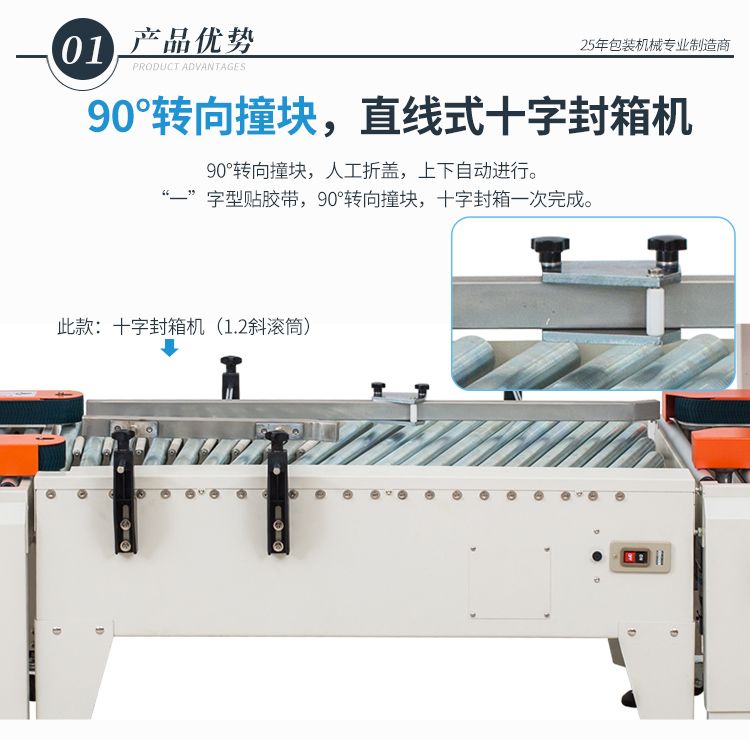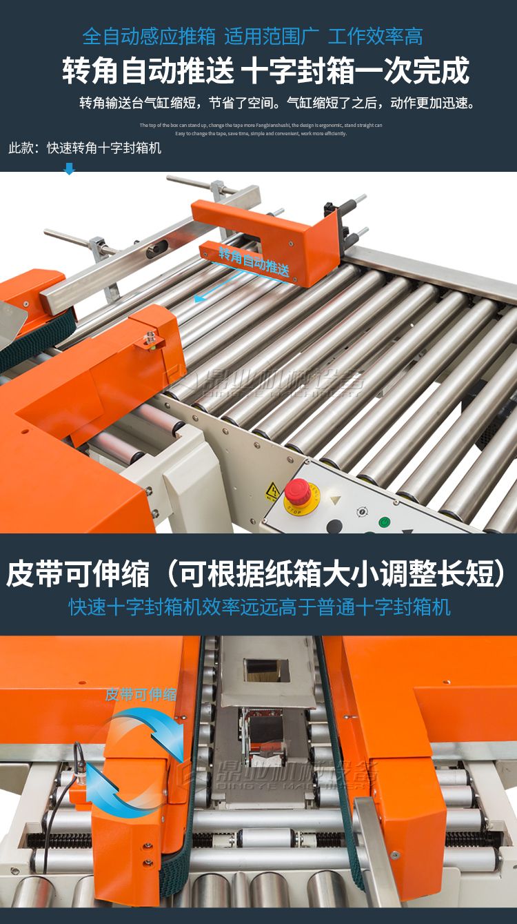 十字封箱机是一款组合型设备,主要是采用我们常用的半自动封箱机和输送台组合完成一字封箱,然后通过侧推机构将纸箱进行90°转向,然后进入半自动封箱机完成十字封箱包装。