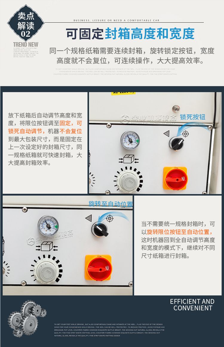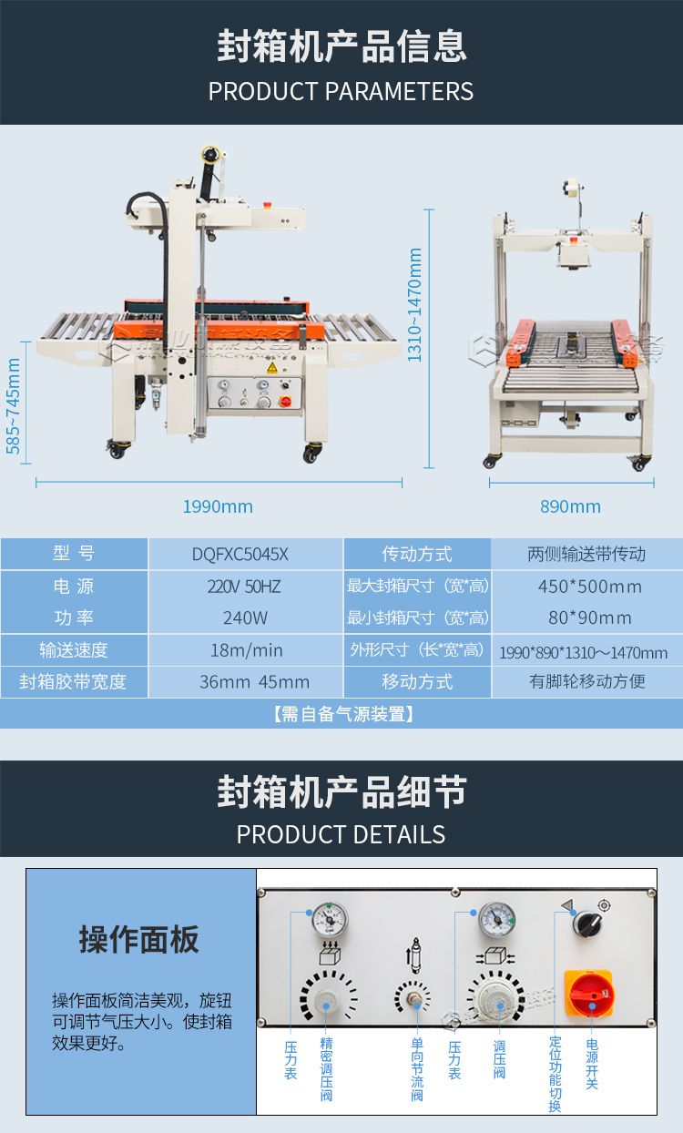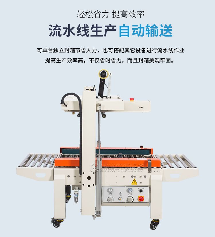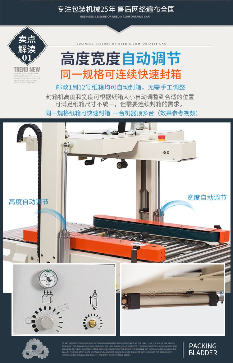 本款全自动封箱机,利用气动装置(需自备起源),可自动调整宽度和高度来进行封箱,无需人工手动调整。邮政1-12号纸箱均可封箱,对尺寸大小不一样纸箱可自动连续封箱。生产效率更高