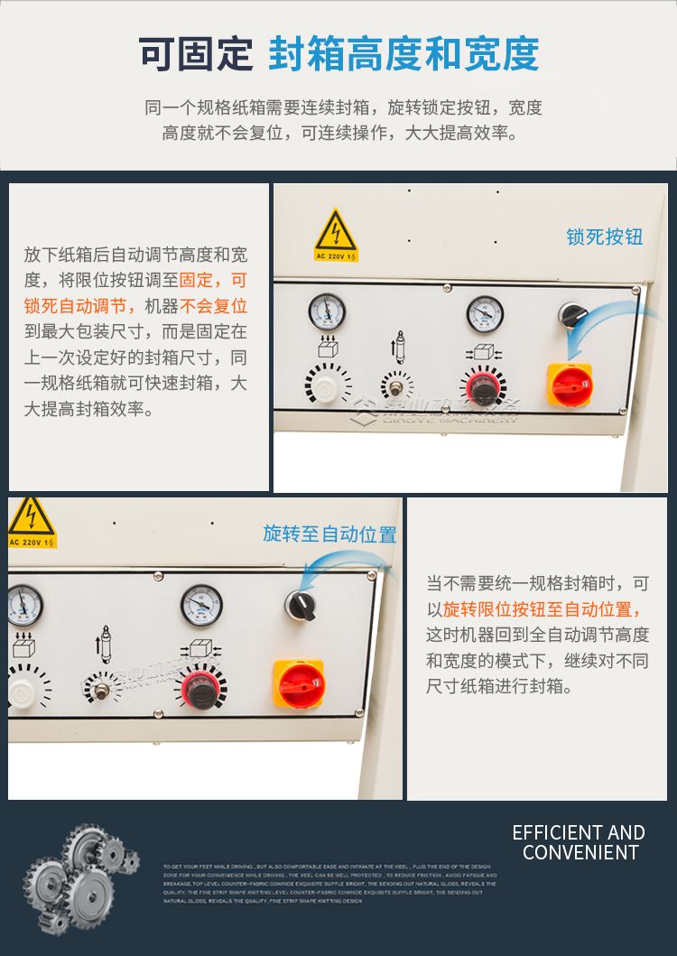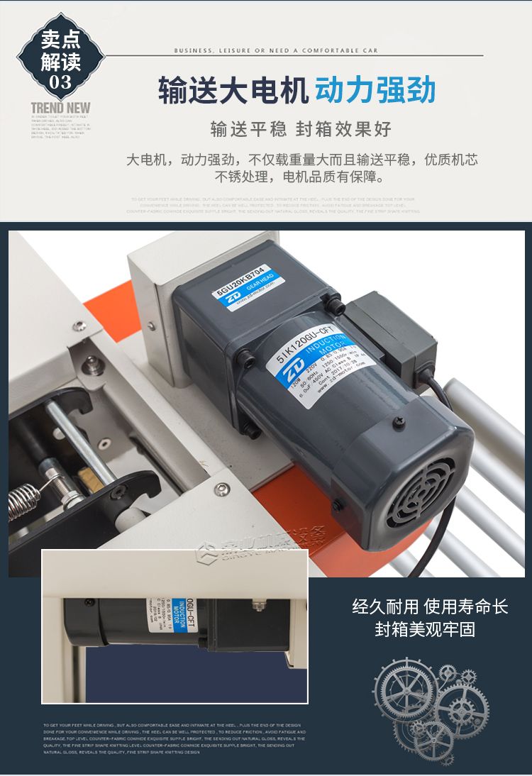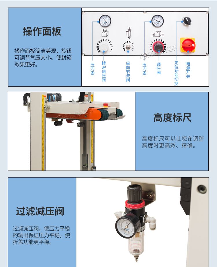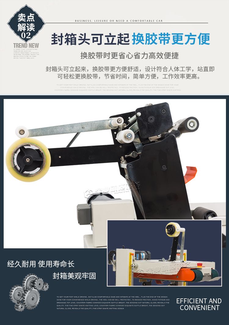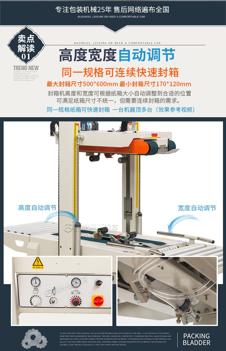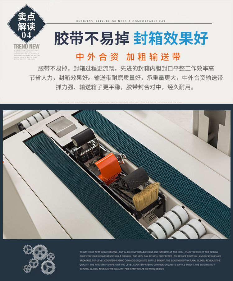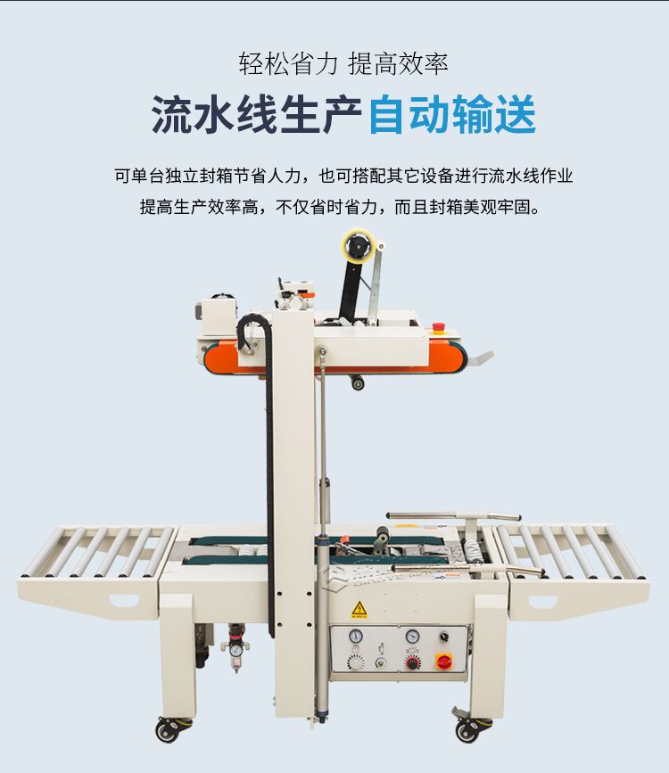 封箱机采用即贴胶带封纸箱封口,经济快速、容易调整,可一次完成上、下封箱动作,也可以采用印字胶带,更可提高产品形象。