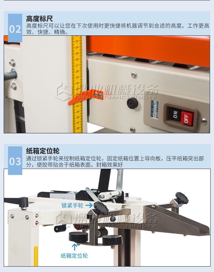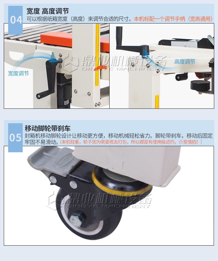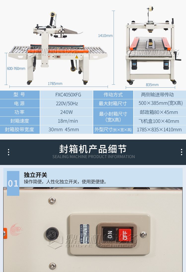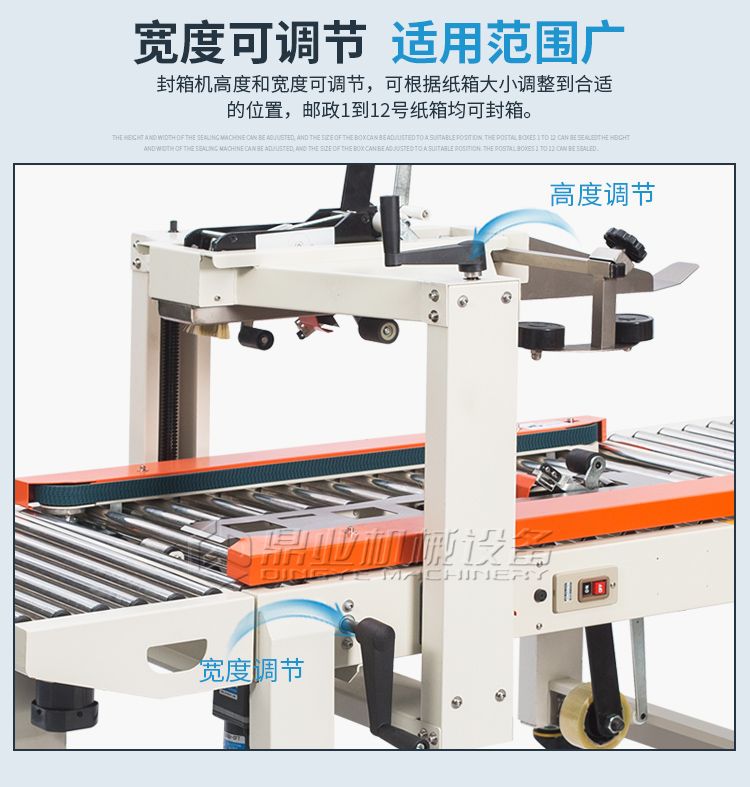 左右驱动胶带封箱机主要适用于纸箱的封箱包装,即可单机作业成绩,也可与流水线配套使用,广泛应用在家用电器、纺织、食品、百货、医药、化工等行业。封箱机采用即贴胶带封纸箱封口,经济快速、容易调整,可一次完成上、下封箱动作,采用印字胶带,更可提高产品形象。