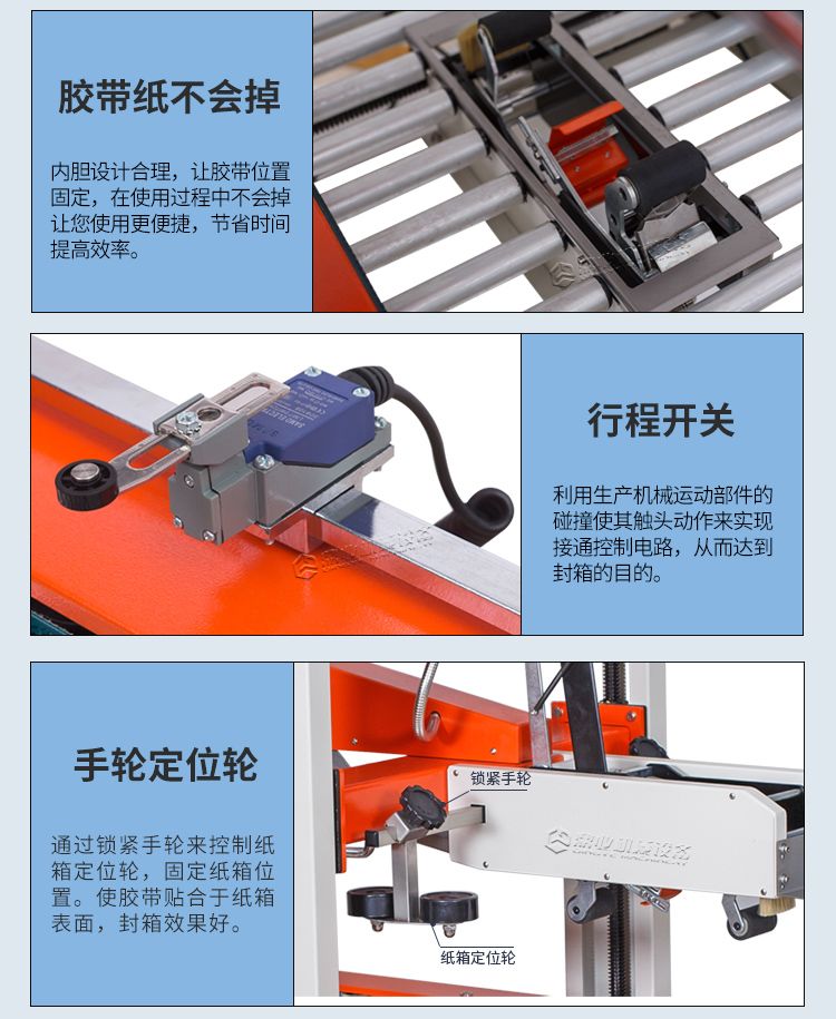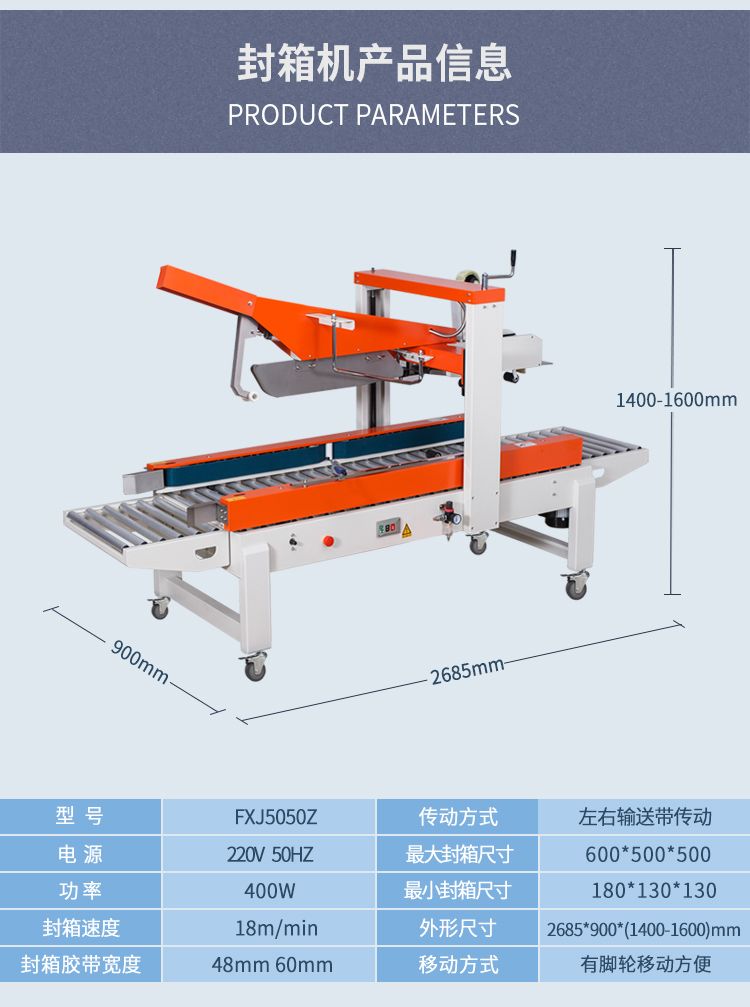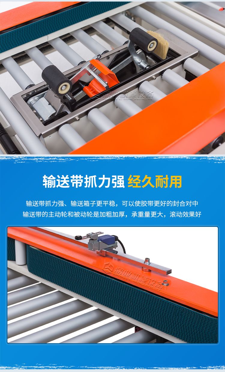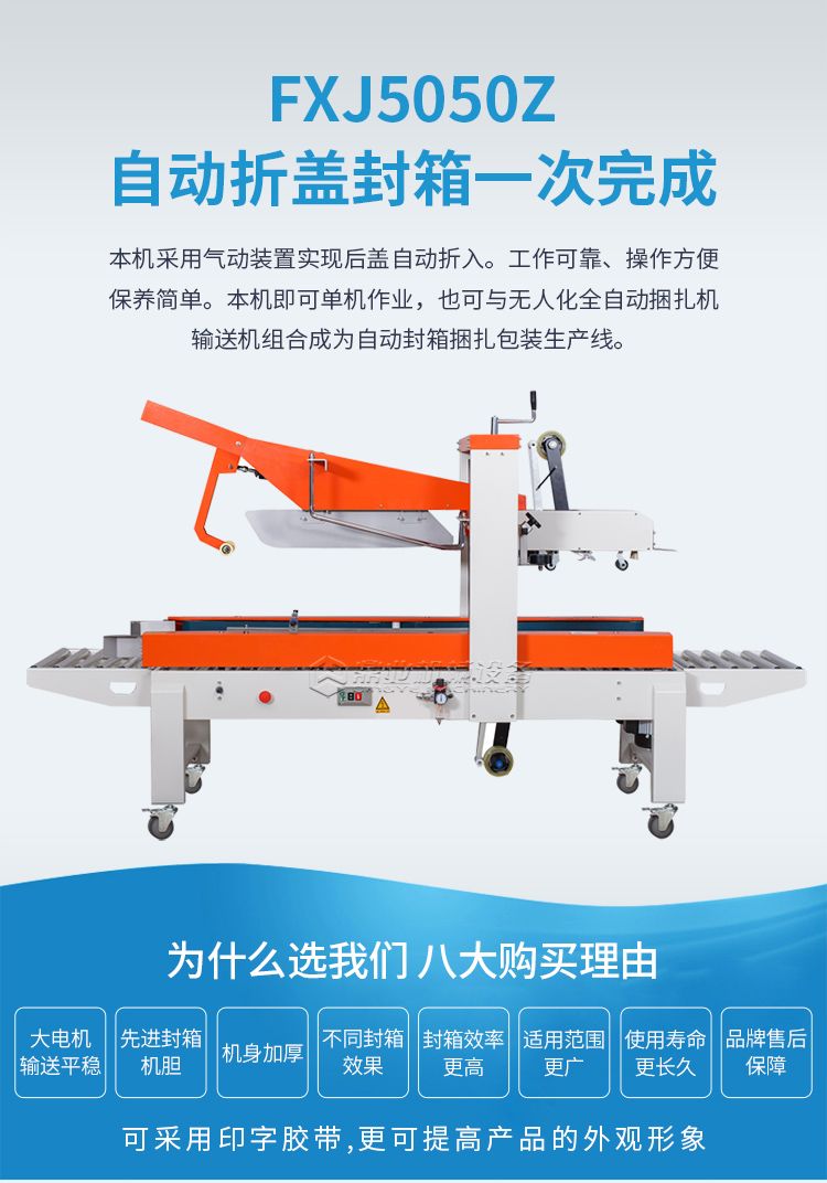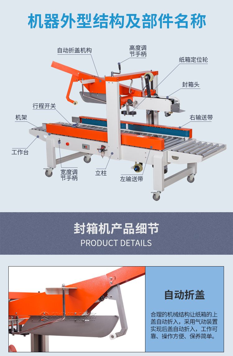 自动折盖封箱机主要适用于纸箱的折盖和封箱包装,适合单独操作或连接到自动流水线,广泛应用在家用电器,纺织,食品,百货,医药,化工等行业。纸箱上前盖,侧盖及后盖自动折入,快速,平顺。