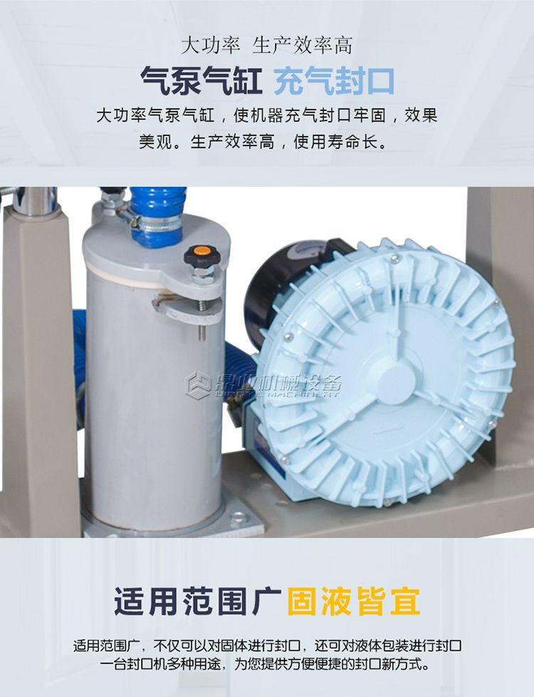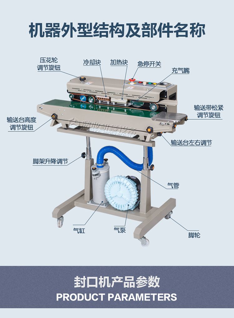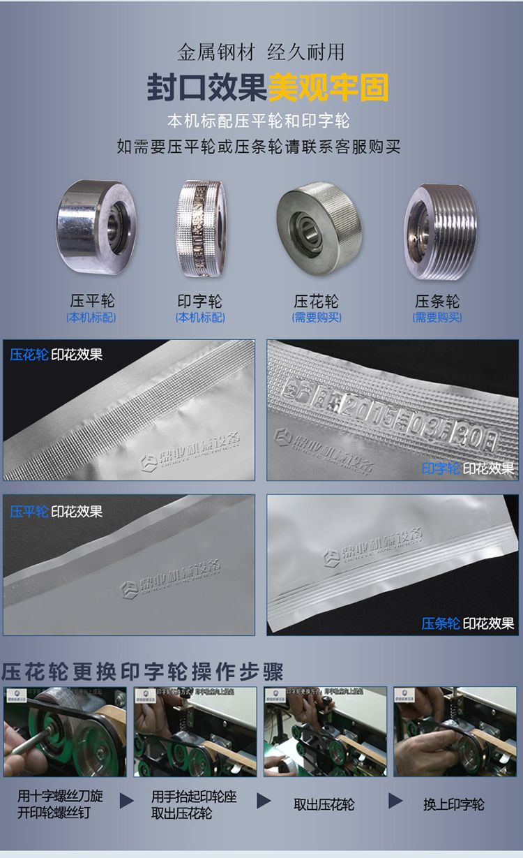 由于本机采用电子恒温控制和无级调速的传动机构,可封制各种不同材料的塑料包装袋,由于本机体积小,应用广泛,封口长度不受限制,所以可与各种包装流水线配套使用。它将是工厂、商店批量产品包装的**封口设备。