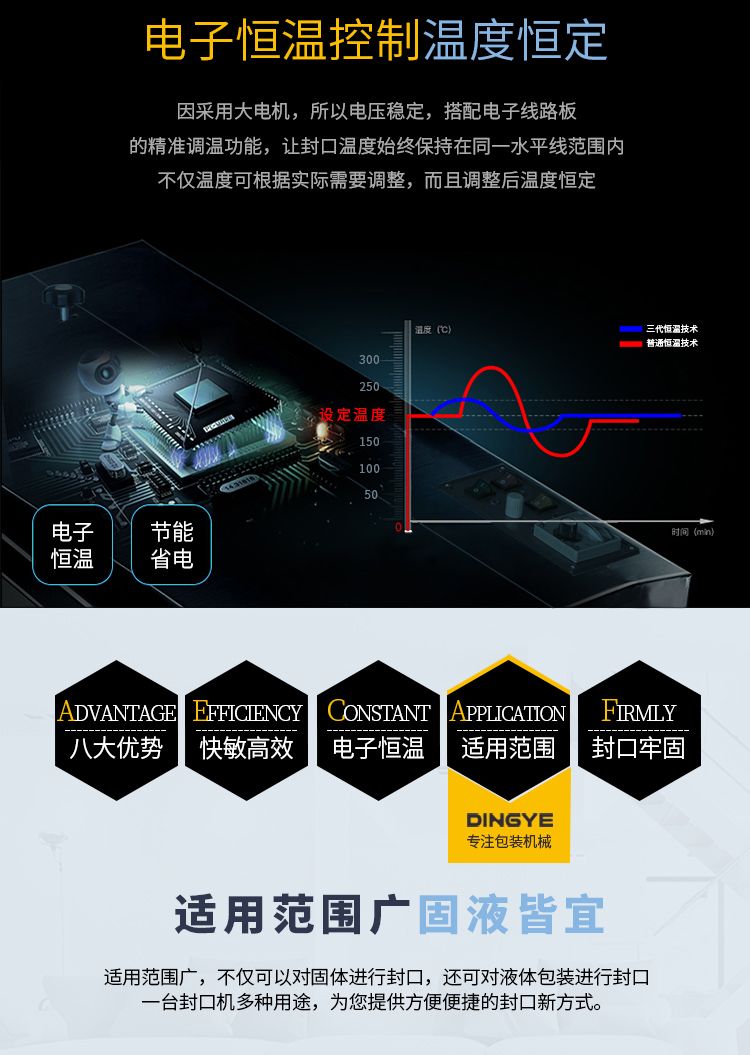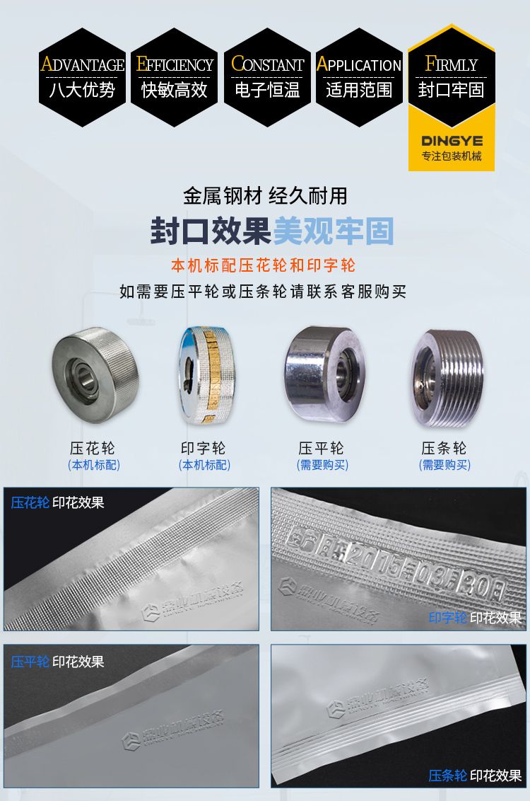 由于本机电气控制简单,合理而精制的机械传动,从而结构性能非常稳定,故障率低,且使用寿命更长。可长时间连续工作,能满足大批量生产需求。产品经过该机的封口包装后,且具外形美观、整洁、防尘、防潮、防破损、便于搬运和储存。大大降低产品的损耗,且具包装成本优势。