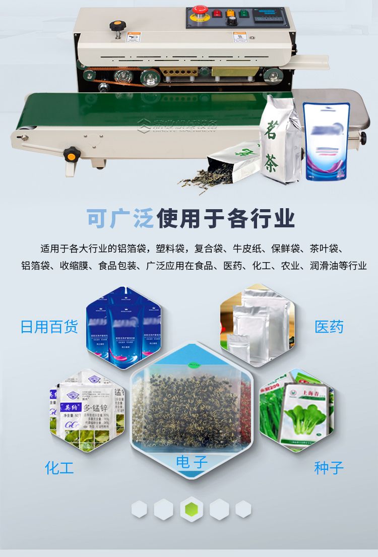 本机使用于塑料薄膜的封口、制袋,可广泛应用在食品、医药、化工、日用、种子等行业。