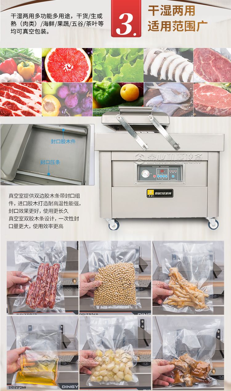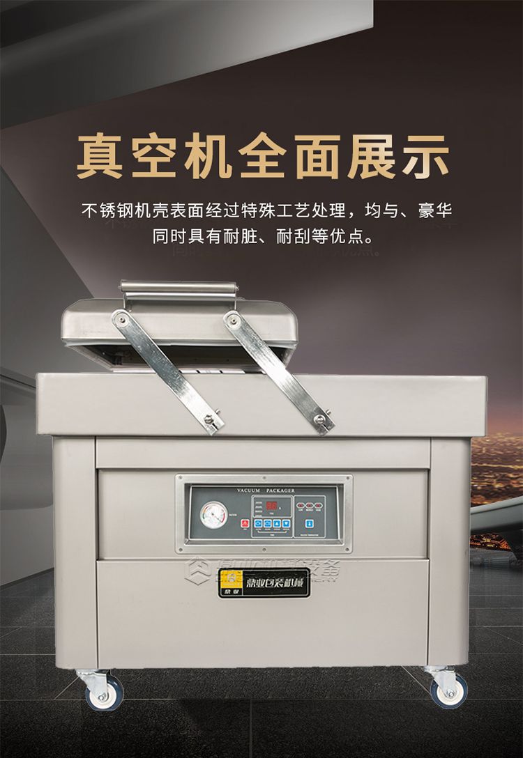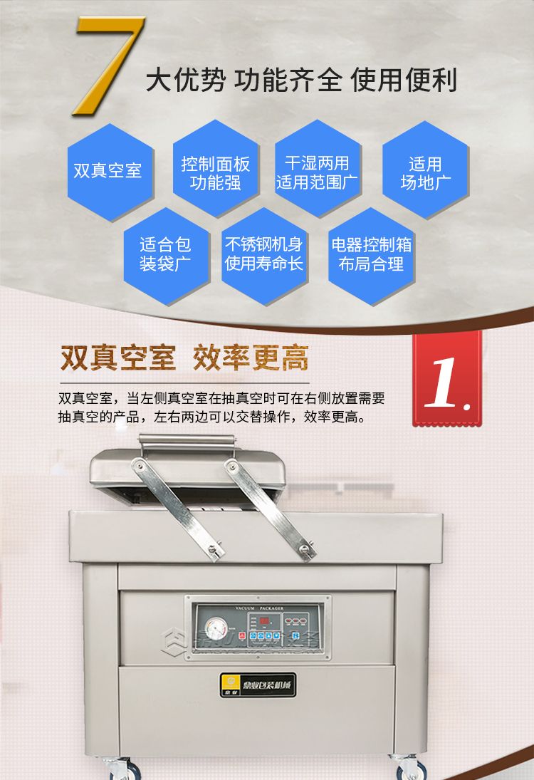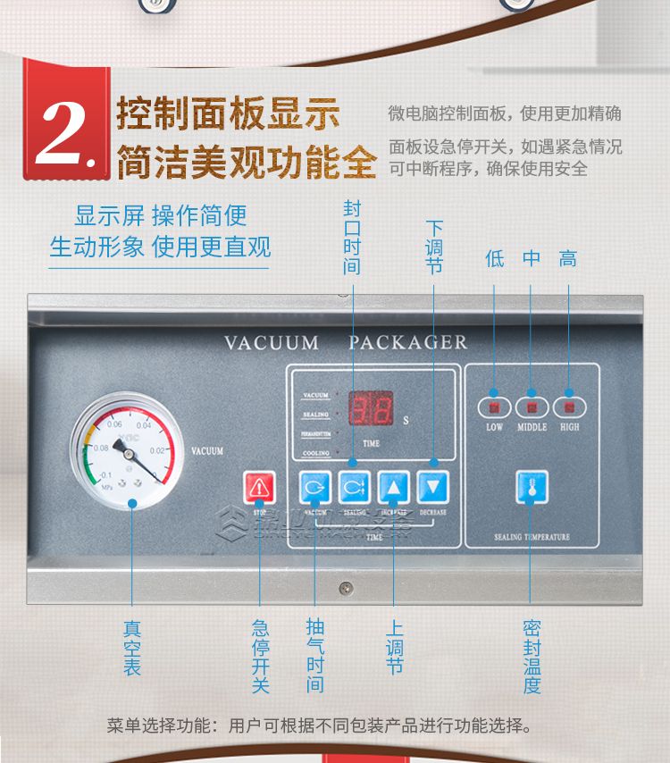 本系列真空包装机具有抽真空、封口、印字一次性完成的功能。适用范围:肉品、水产食品、农产品、腌渍物、快餐品、调理食品、粉类、香料、电子、五金零件、药品,经真空封装后,可以有效地起到保鲜、保质、防潮、防霉、防锈、防污染、防氧化及真空灭菌的作用,从而延长保存期。