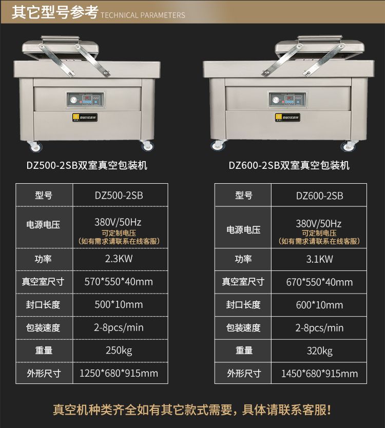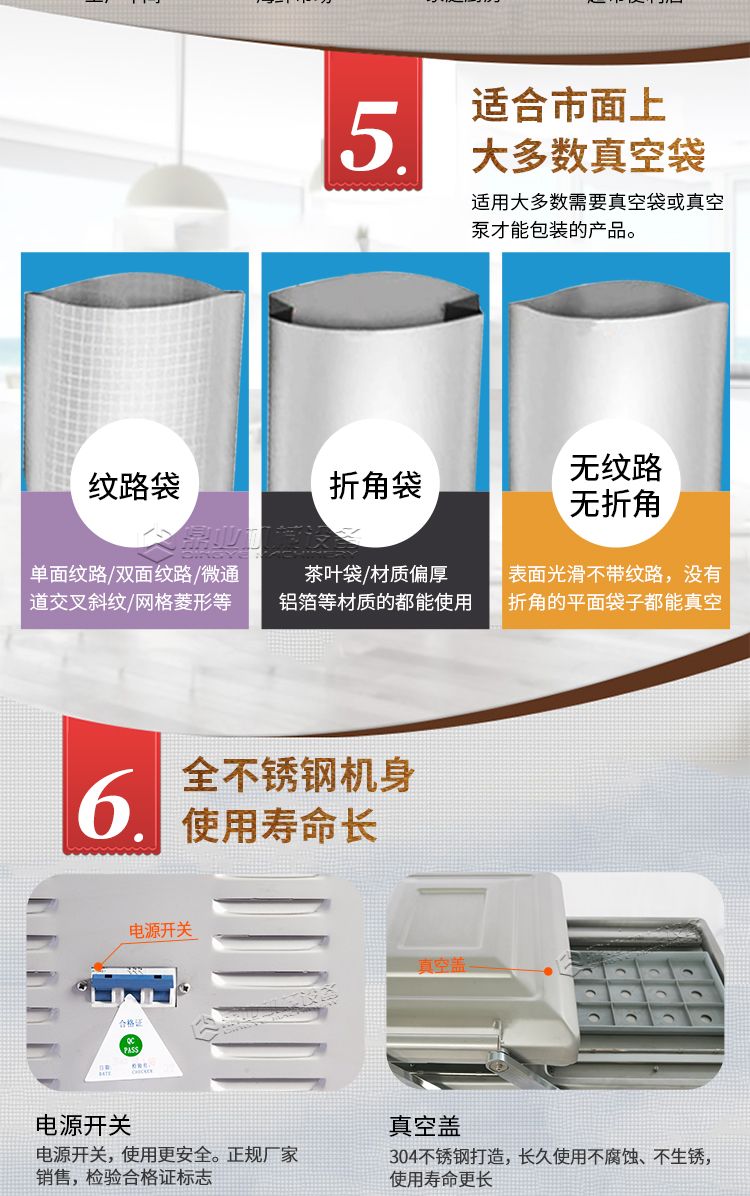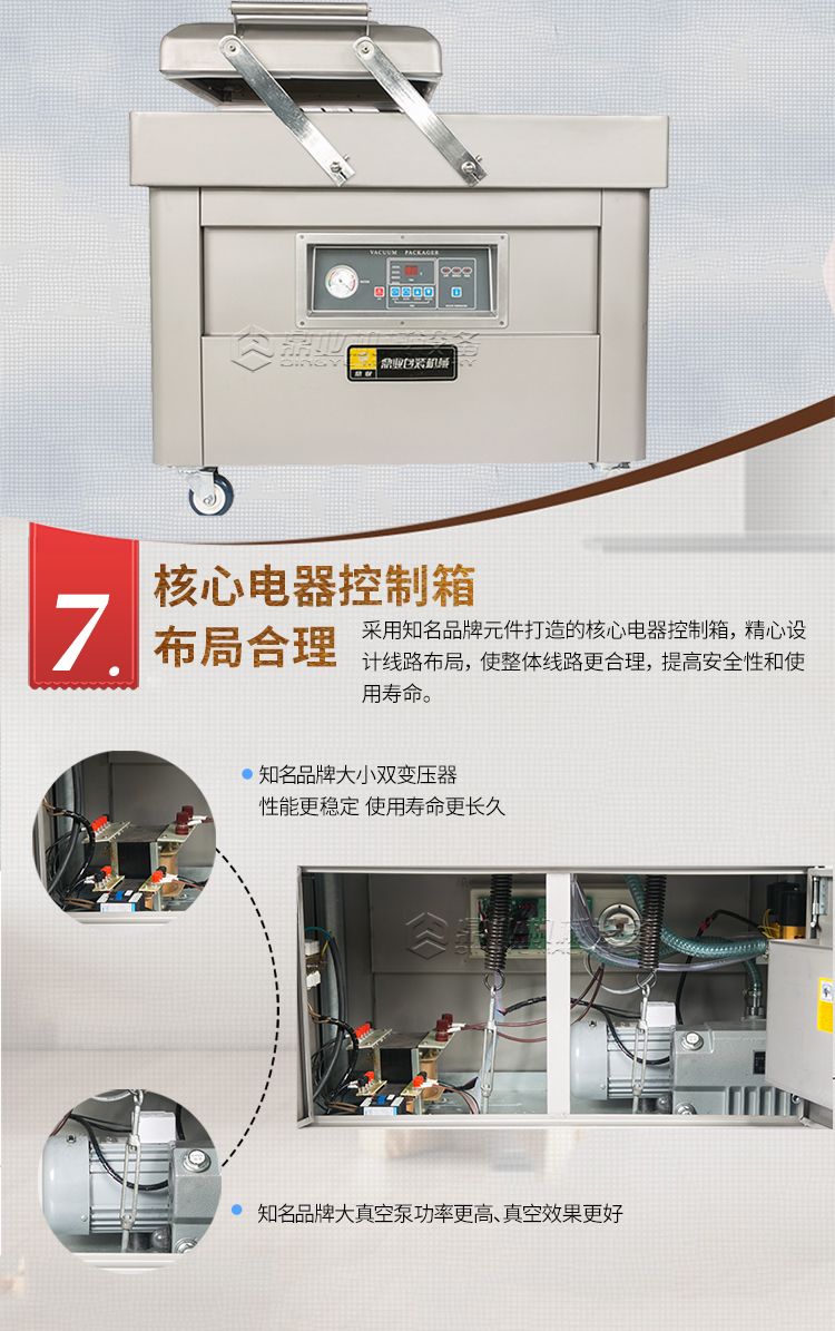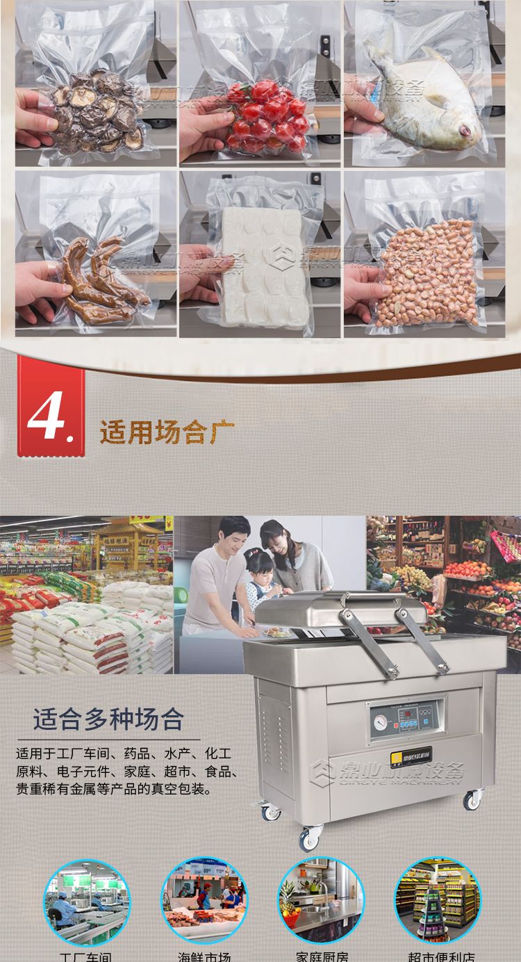 本系列真空包装机具有抽真空、封口、印字一次性完成的功能。适用范围:肉品、水产食品、农产品、腌渍物、快餐品、调理食品、粉类、香料、电子、五金零件、药品,经真空封装后,可以有效地起到保鲜、保质、防潮、防霉、防锈、防污染、防氧化及真空灭菌的作用,从而延长保存期。