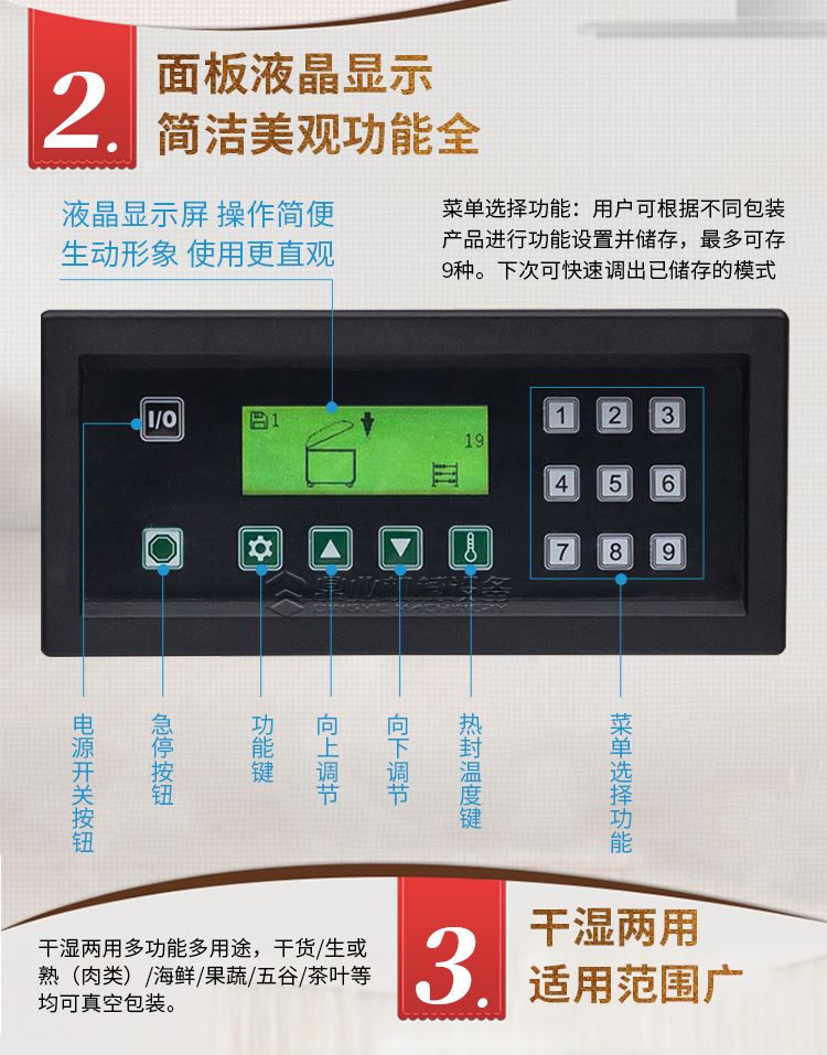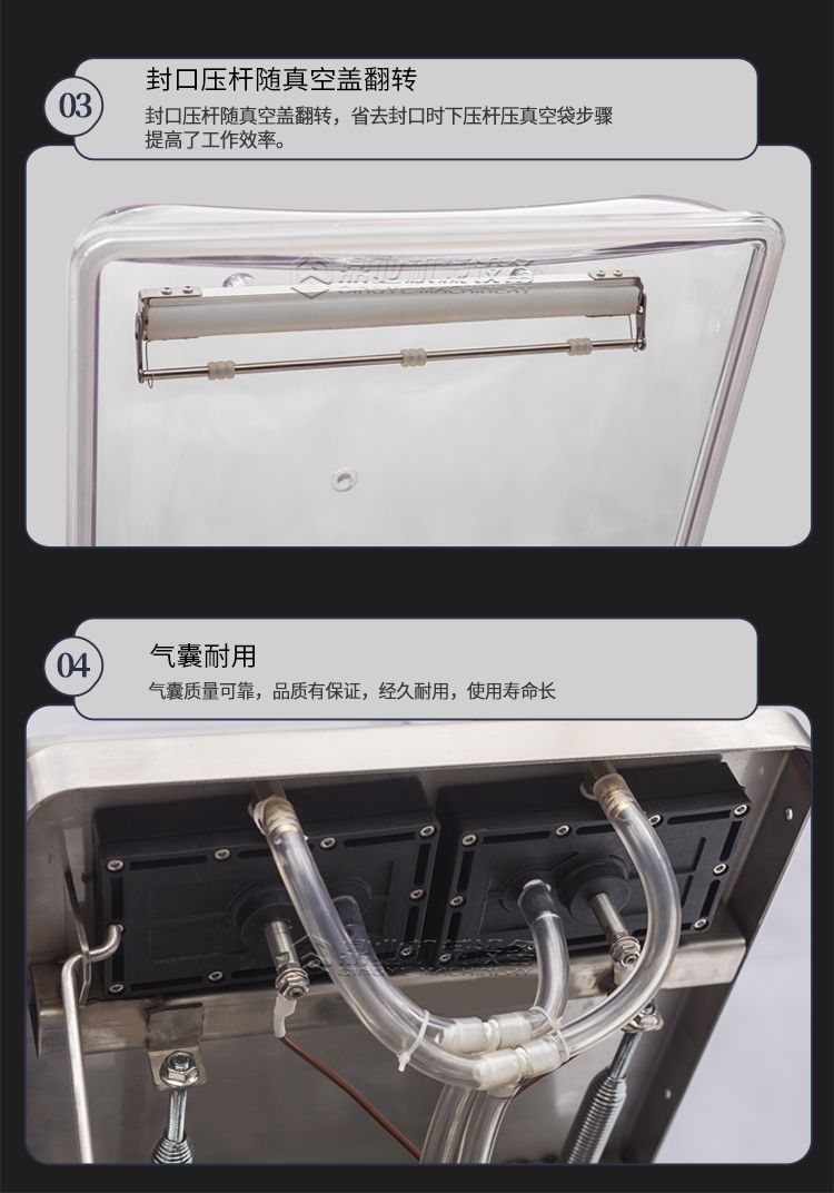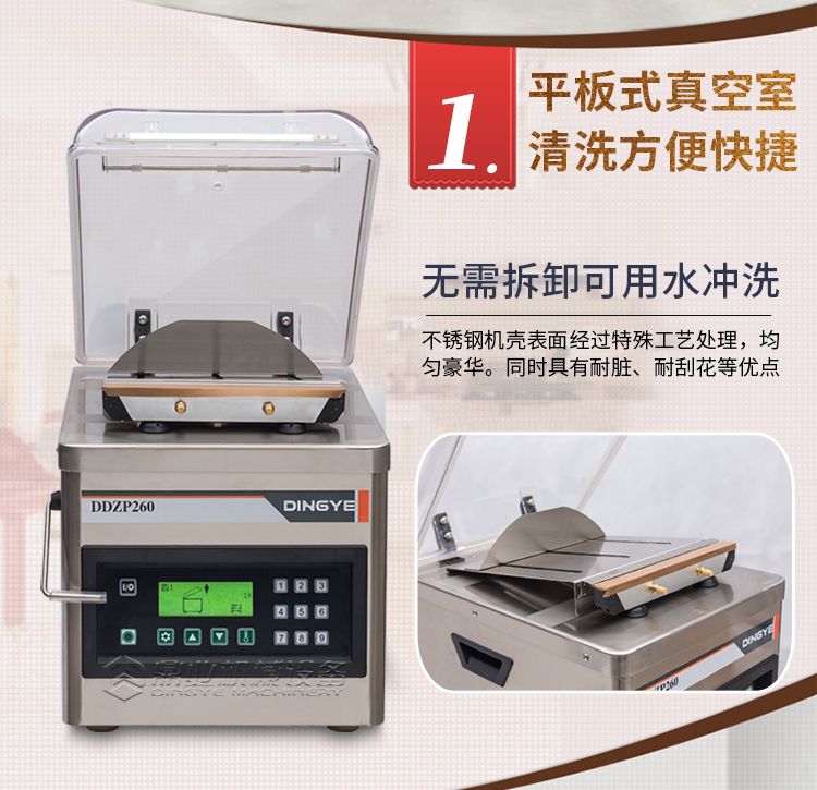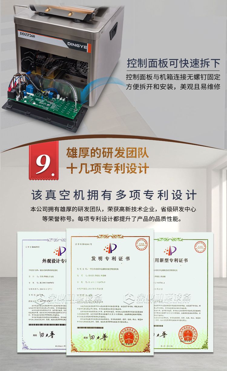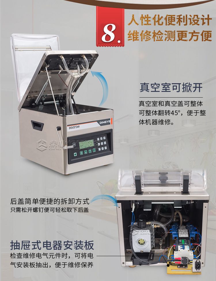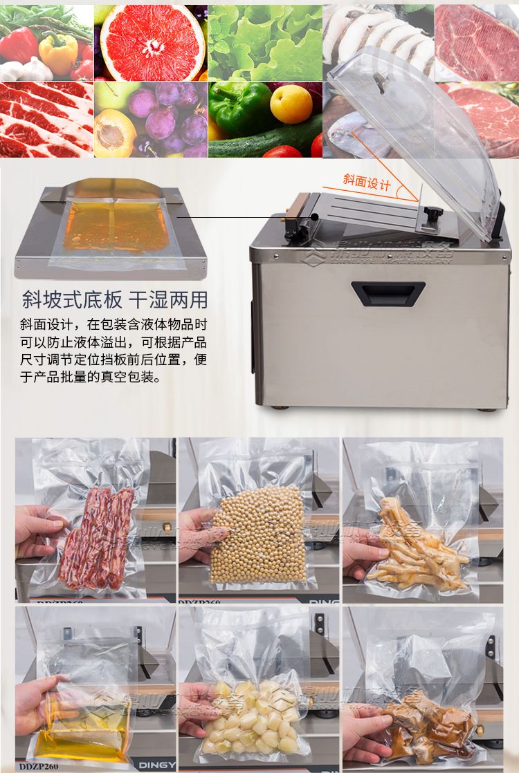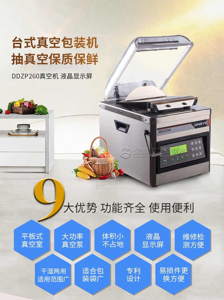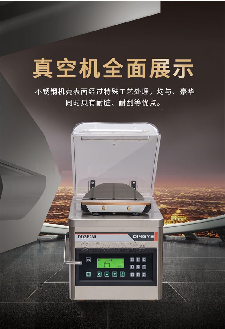 DDZP260真空机适用如:肉类加工、酱腌产品、水产、海产品加工、蔬菜加工、农副产品加工、果脯、粮食、豆制品、药材、电器、化学制品等颗粒、粉状、液体等食品进行真空后充惰性气体包装、可以防止产品氧化霉变、腐败、防潮达到延长产品的储存期限。