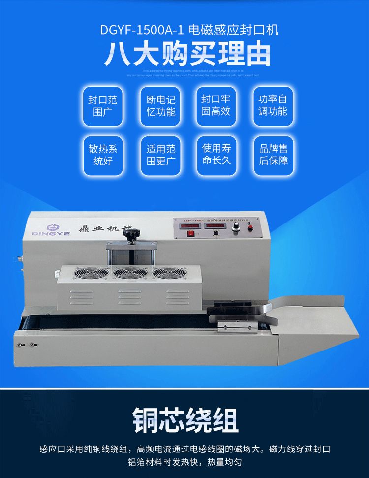本公司采用国际先进的加热工艺技术,关键电子原件选用进口原件,并根据本公司多年的生产经验积累与摸索改进,现开发生产的LGYF-1500型系列电磁感应封口机,在机器性能稳定性和工作效率方面都取得重大突破,逐渐成为国内市场较受欢迎的质高价廉的感应封口设备。