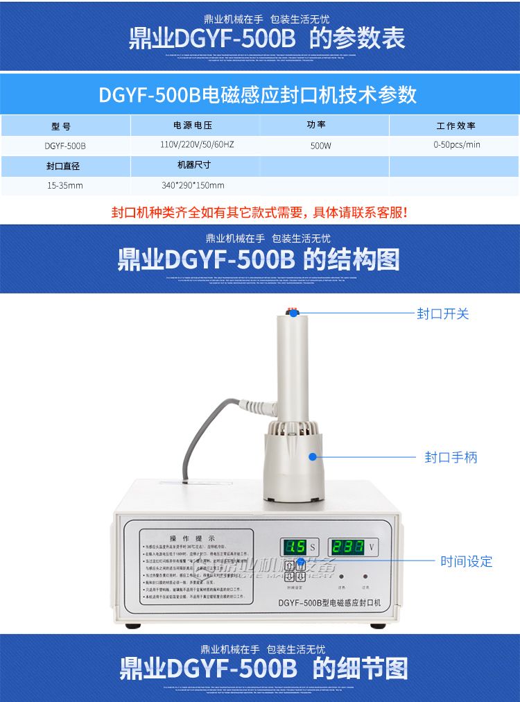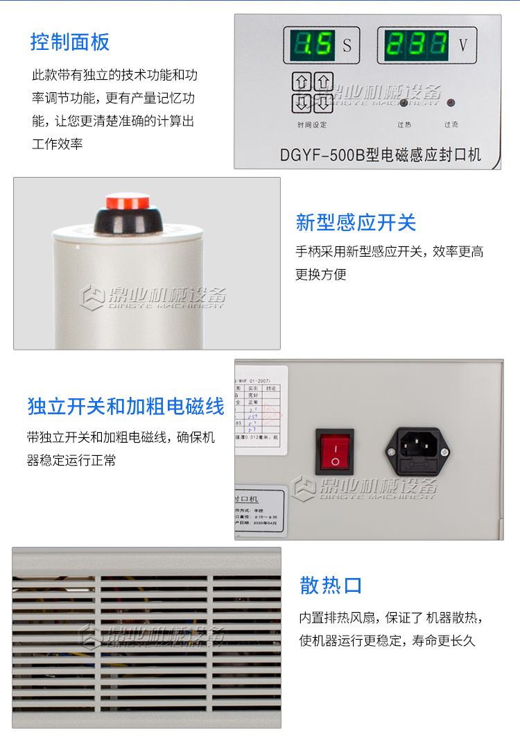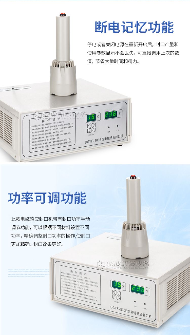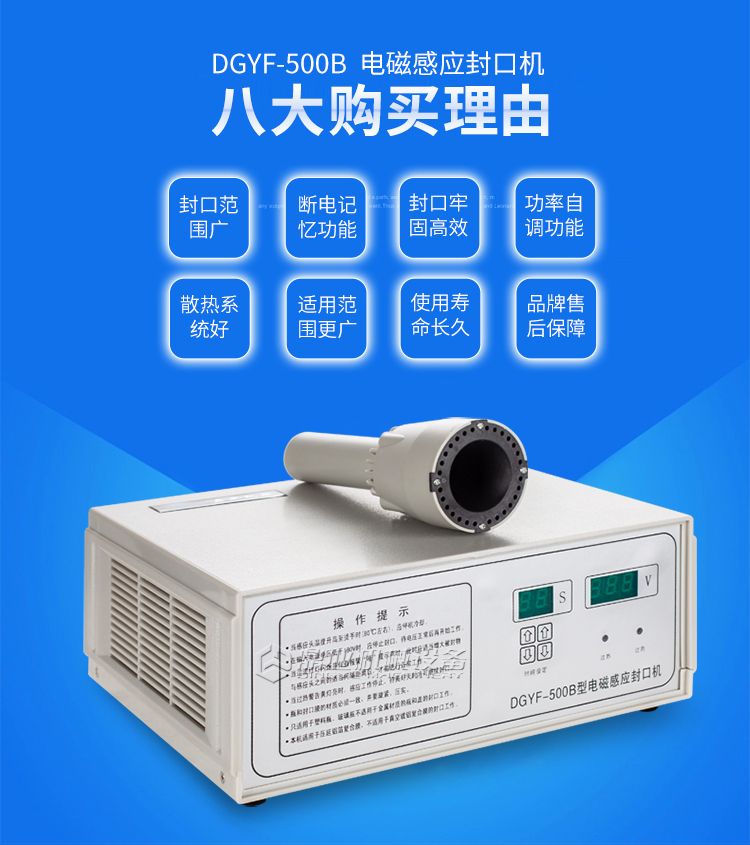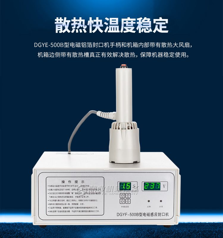 本机采用电磁感应加热原理,通过非接触感应加热,使感应膜瞬间产生热量熔化,牢牢地粘贴在瓶口上,达到密封封口之目的。