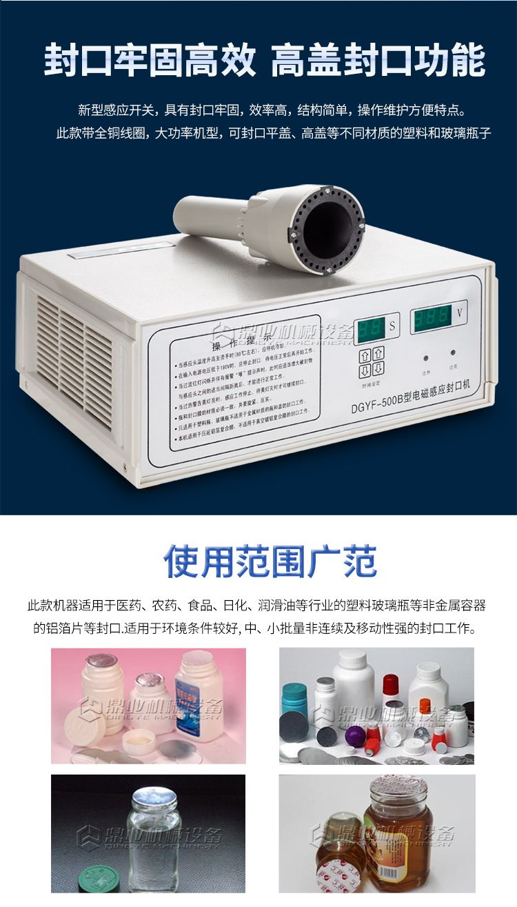 采用手持式电磁感应封口机对塑料、玻璃等非金属瓶子进行感应加热封口,是当今流行的密封封口的方法。通过感应加热封口的产品,在产品档次、防止潮湿、延长保质期、加强防伪以及封口速度和封口质量都有明显的提高。已被广大药物、化工、食品、饮料、油脂、化妆品等行业所采用,并成为必备封口设备。