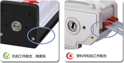 | 传统泵头采用荆棘轮调节压管间隙,过压后不能回调,必须松开卡片重新调节,调节过程中,圆弧不是整体移动,而是部分圆弧与滚乱间隙变小,造成整个圆弧范围内压管间隙不均匀,局部地方会过压,软管寿命短;而MCX泵头采用凸轮结构,可以前后任意调节,调节过程中,圆弧整体向滚轮靠拢或者分离,压管间隙均匀,保压能力强,软管寿命长。另外,纳通卡片采用进口POM原料,含有铁氟龙成分,更加耐磨,泵头寿命更长。