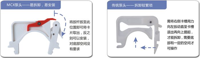 | 传统泵头需要用力从下方开启卡片,在通道数目较多的情况下,操作困难,需要的空间大,在空间紧凑的配套设施中,应用不便;而MCX泵头的凸轮结构可以让用户方便的从上方摘下卡片,操作简单。