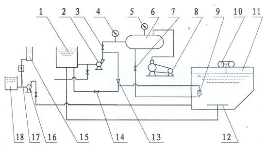 污水经絮凝反应后进入混合区,与溶气水混合接触。絮体与溶气水中的小气泡相互粘合,然后进入气浮区,并随小气泡一同浮到水面,形成浮渣。下层的清水经集水器流至清水池后,一部分回流作溶气水,剩余清水通过溢流口流出。气浮池上面的浮渣由刮板刮至污泥池并最张排出。