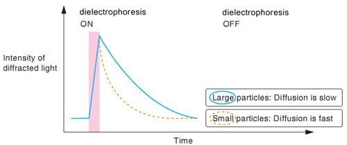 纳米粒子在介质中的折射率的变化量受其浓度影响。因此,如果在外力的作用下让颗粒在介质中形成周期性变化的颗粒浓度分布,形成类似光栅的的形状,那么它将起到衍射光栅的作用。如果除去外力,随着粒子的分散,光栅也会消失。具体到IG方法,是通过出去外力后,粒子聚集形成衍射光栅逐渐消失所引起的衍射光强度的变化的强度和时间来测定粒子粒径的。