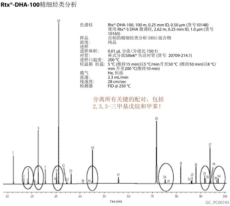 汽油是数百种化合物组成的复杂混合物。有关各个组分的浓度是评估原料及控制炼油过程的重要信息。ASTM D6730-01概括了汽油中详细烃类分析(DHA)的高分辨率气相色谱法。RTX®-DHA是DHA方法的理想色谱柱,轻松地达到或超过ASTM D6730-01和加拿大通用标准委员会CAN/CGSB 3.0 No.14.3-99的要求。每一根Rtx®-DHA色谱柱对保留时间,效率,固定相选择性,和柱流失进行测试—保证柱与柱之间的重现性。
