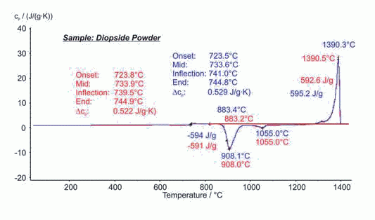 图中显示的是透辉石玻璃粉末两次测试的结果。玻璃化转变发生在723°C~745°C之间,重结晶出现在883°C(起始点),熔融出现在1390°C(主峰温度)。两次测试分别取样,得到的数据包括特征温度和相应的热焓计算都吻合的很好,而且两次测试过程中样品比热也基本无差别。这说明DSC 404 F1 Pegasus? 具有非常出色的稳定性和测试重复性。