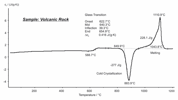 岩石作为一类化学组成非常复杂的天然材料的泛称,一般很难进行分析。这类材料通常是多种多样的氧化物,硫酸盐或碳酸盐的混合物。火山岩通常由熔融岩浆凝固而成,其主成分为多种氧化物。本例显示了对于某种岩石材料的 DSC 测量结果。玻璃化转变发生在 623°C 至 655°C 之间,在 884°C 与 1111°C 分别检测到了冷结晶与熔融峰(均取峰值温度)。冷结晶的放热热焓与熔融的吸热热焓相近,证明了该混合物接近于完全的无定形材料。
