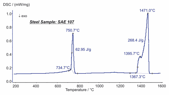 图中显示的是钢(SAE 107)的相结构转变测量。在 751°C 前后,发生了两种相互重叠的相变过程,735°C 之前热流的平缓增大是由居里转变(铁磁性能的转变)引起,而高而尖锐的主峰则由结晶结构的改变(铁素体转变成奥氏体)所致,其相应吸热热焓为 63J/g。在 1367°C 可以观测到两步熔融过程(峰值在 1395°C 与 1471°C),熔融热焓为 268 J/g。