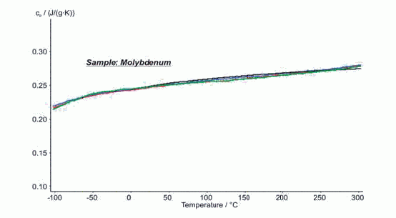 使用DSC 404 F1 Pegasus® 新型低温炉体测试金属钼从-100°C~300°C之间的比热,实验重复测试三次。三次测试结果的分散度很小,在2%以内。图中黑色曲线是纯金属钼室温至300°C的文献值,测试数据与文献值的偏差小于2%。这表明DSC 404 F1 Pegasus® 在低温依然保持很好的性能。