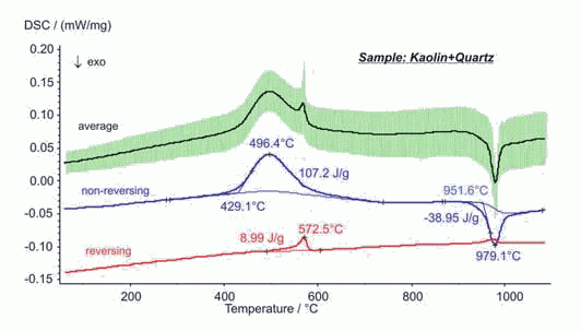 TM-DSC 通常被用于高分子材料的低温测试,而 DSC 404 F1 Pegasus® 是世界上第×台将TM-DSC应用到高温测试的仪器。图中显示的是高岭土石英混合物的测试结果。在DSC不可逆曲线上可以观察到高岭土不可逆的脱水过程和相变。,而DSC可逆曲线上则观察到石英在 573°C 的相变效应。