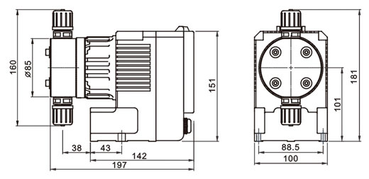 型 号 | 流量 L/h | 压力 Psi | 冲程 mm | 频率min-1 | 膜片 规格 | 功率 w | 电压 V/Hz | 进出口径联接方式 | ||