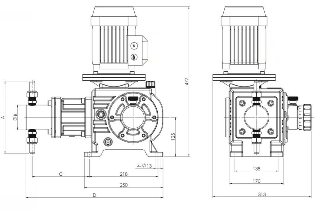 | 型号 | 流量 L/H | 压力 Mpa | 柱塞直径 mm | 行程 mm | 泵速 min-1 | 电机功率 kw | 进出口径 | 联接方式 |