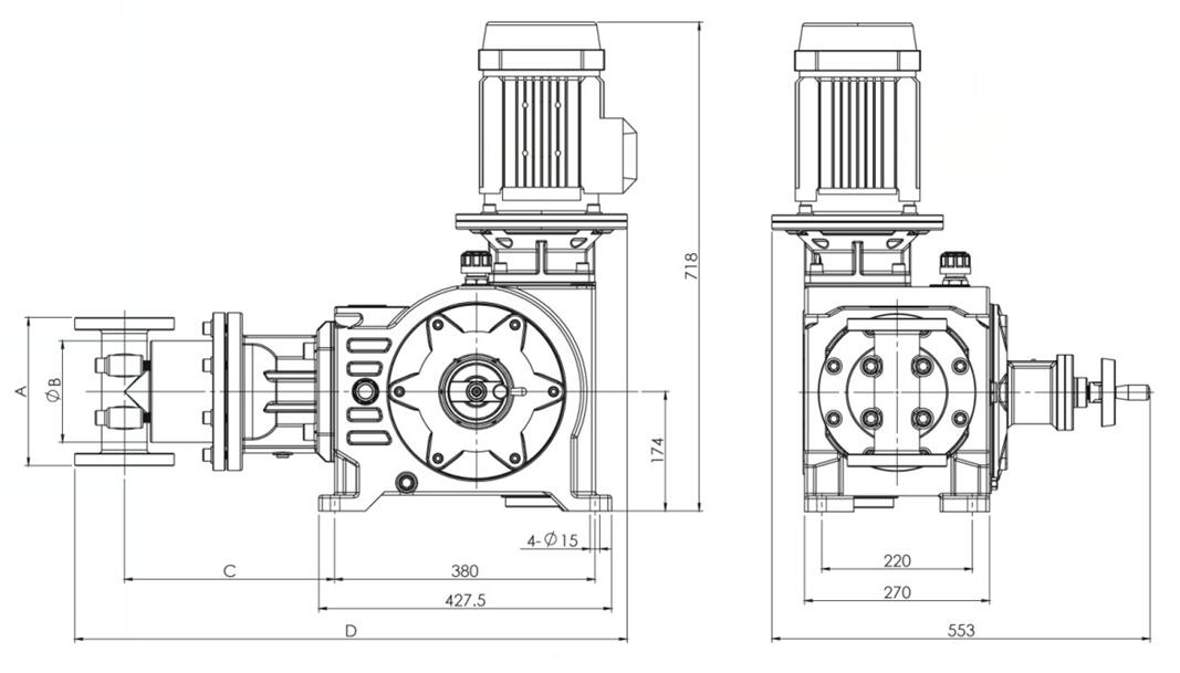 | 型号 | 流量 L/H | 压力 Mpa | 柱塞直径 mm | 行程 mm | 泵速 min-1 | 电机功率 kw | 进出口径 | 联接方式 |