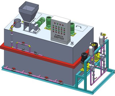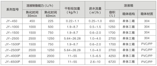聚合物溶液制备过程是通过各个溶液箱分级逐步处理完成的,溶液箱之间隔开。保证每个溶液箱内的最佳反应时间和恒定的浓度,避免在预制箱和最终溶液箱之间产生任何直接通路。该设备由控制箱自动控制,此控制箱与安装在最终溶液箱上的液位计相连,一旦液位达到“低位”,触发电动进水阀打开。触点式流量计就启动干投机,干投量的大小按照水量而定,以获取精确的浓度。一旦达到“高位”此循环过程就停止。当然两(或三个)搅拌器还在工作。该设备还用于将乳胶状的阳离子、阴离子或无离子型的聚合物连续自动的制成标准稀释浓度(0.3-5g儿)的溶液。尽管一般认为乳胶状的聚合物制成标准溶液所需的熟化时间大大少于粉粒状聚合物。但是在将药耗达到最佳状态过程中总是推荐要充分的熟化时间。