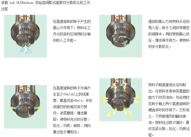 Lab smartShear 实验型高剪切分散乳化机分散原理:在马达的高速驱动下,物料在转子与定子之间的狭窄间隙中高速运动,形成紊流,物料受到更强液力剪切、离心挤压、高速切割、撞击和研磨等综合作用,从而达到分散、乳化、破碎的效果。被加工物料本身和物理性质和工作腔的数量以及控制物料在工作腔中停留的时间决定了粒径分布范围及均化、细化的效果和产量的大小。