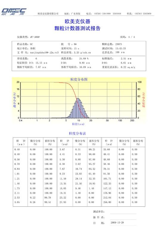 粒度分布表、粒度分布曲线、平均粒径、中值粒径、标准偏差、变异系数、比表面积、颗粒个数等