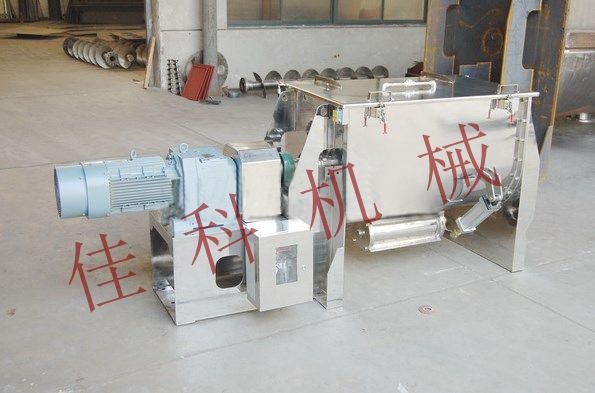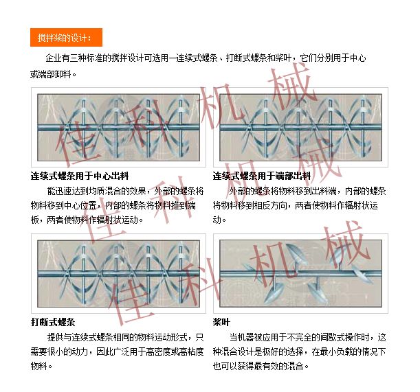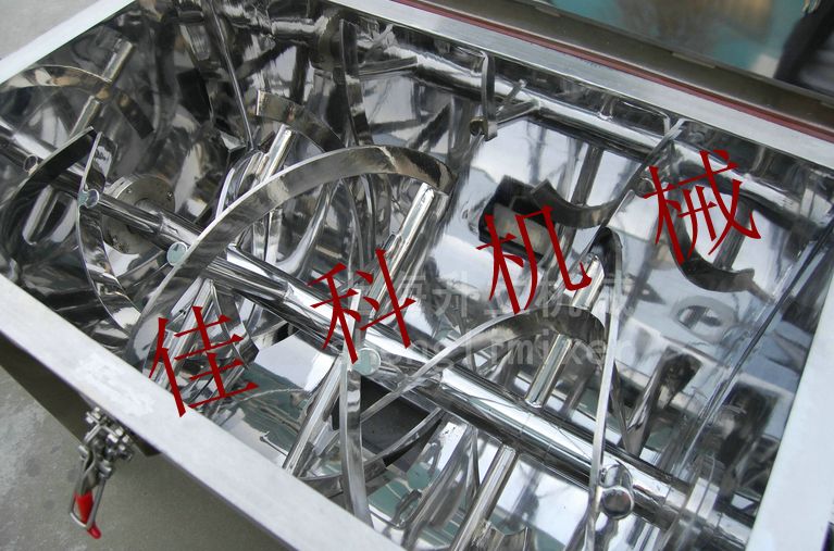 夹层加热螺带混合机由混合仓、搅拌器、驱动装置基本组成,U型管状仓内安装双层异向螺带盘绕的搅拌器轴,外螺旋带在动力的驱动下,其盘绕形式配合旋转方向把物料从U型仓两端向中央地带推动,而内螺旋带把物料从中间向两端推动,形成对流混合。