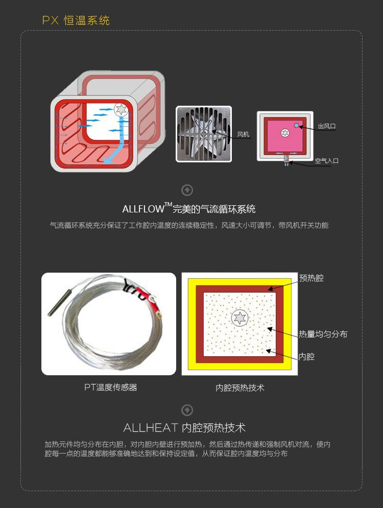 内腔预热技术:ALLHEATTM先进的内腔预热技术是将加热元件均匀地分布在内胆四周,对内腔内壁进行预加热,然后通过热传递和强制风机对流,使腔内每一点的温度都能准确地达到和保持在设定值,从而保证腔内温度均匀分布;