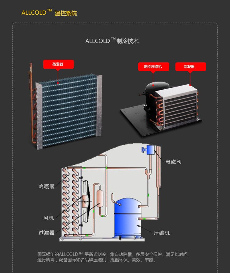 ALLCOLD™制冷技术:国际领创的ALLCOLD™平衡式制冷,集自动除霜、多层安全保护、满足长时间运行所需,配备国际知名品牌压缩机,提倡环保、高效。节能;