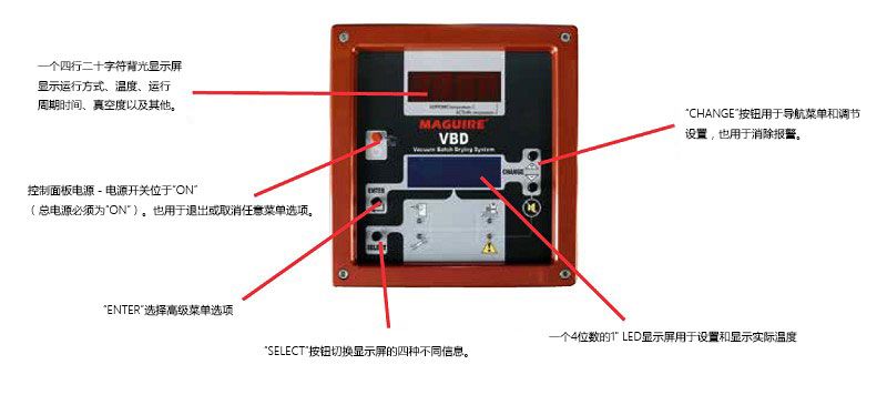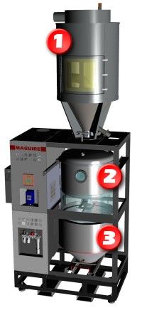 真空发生器: . | ![]() 隔膜式干燥空气发生器: 用于吹入真空料斗和存储料斗以保持物料的干燥 | 加热料斗:隔热的不锈钢料斗,干燥温度达350℉ (175℃). |